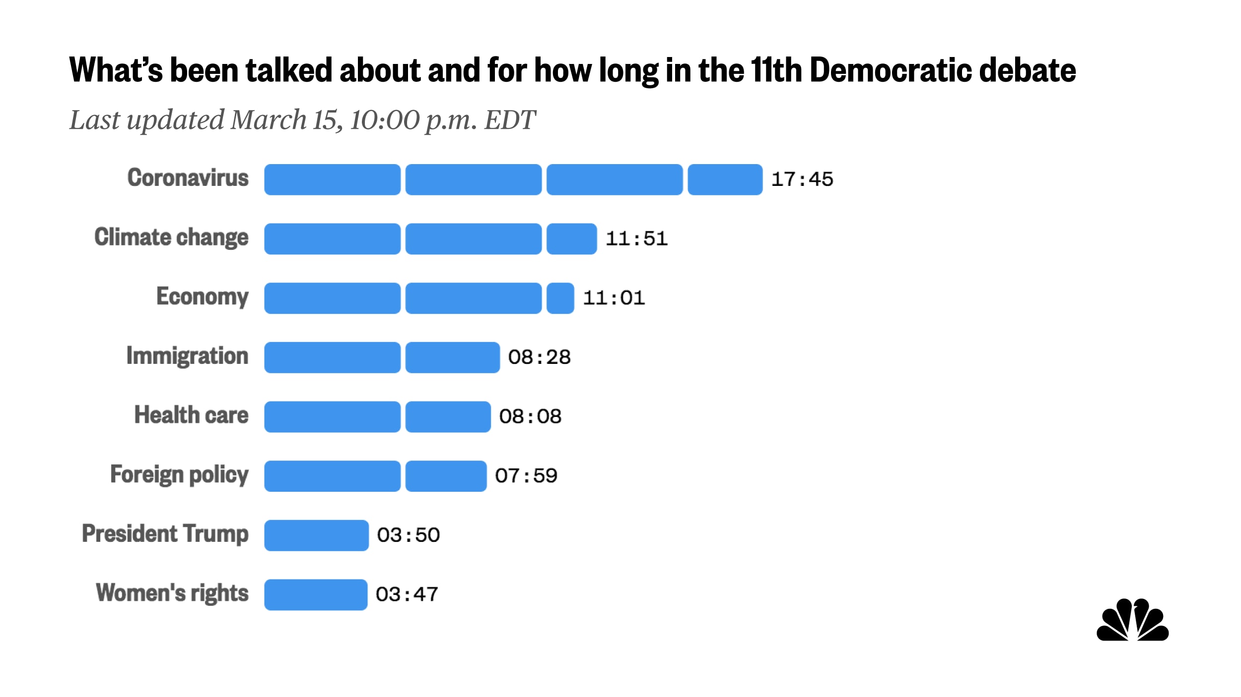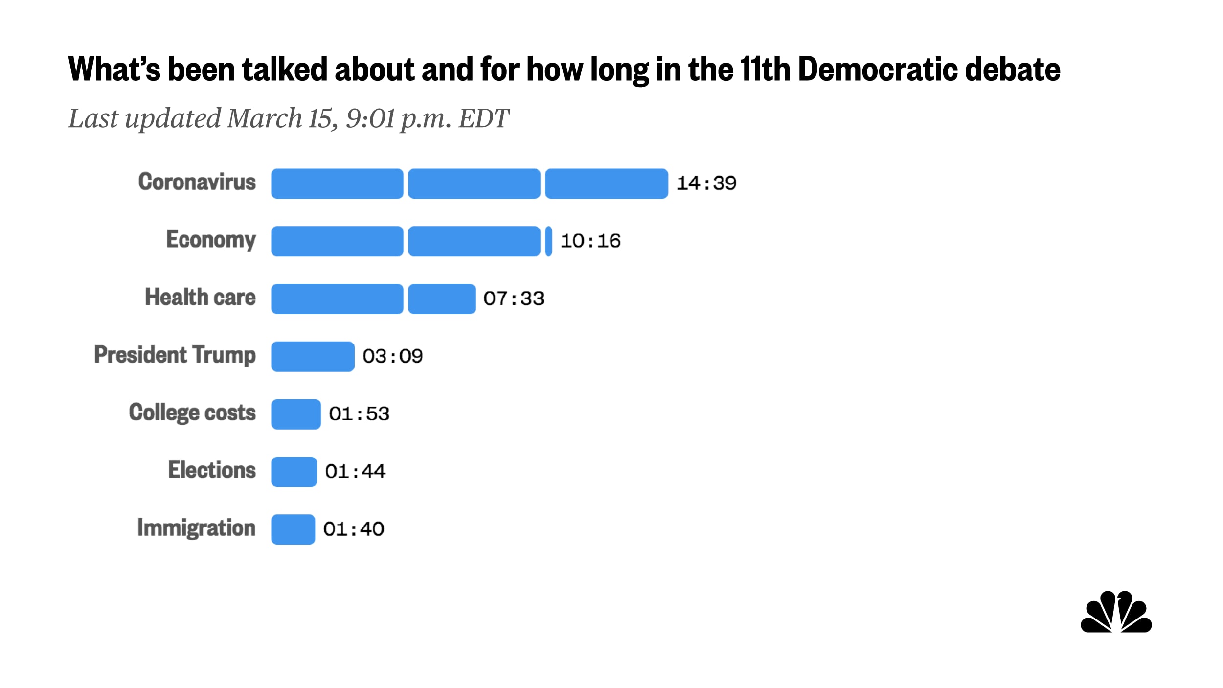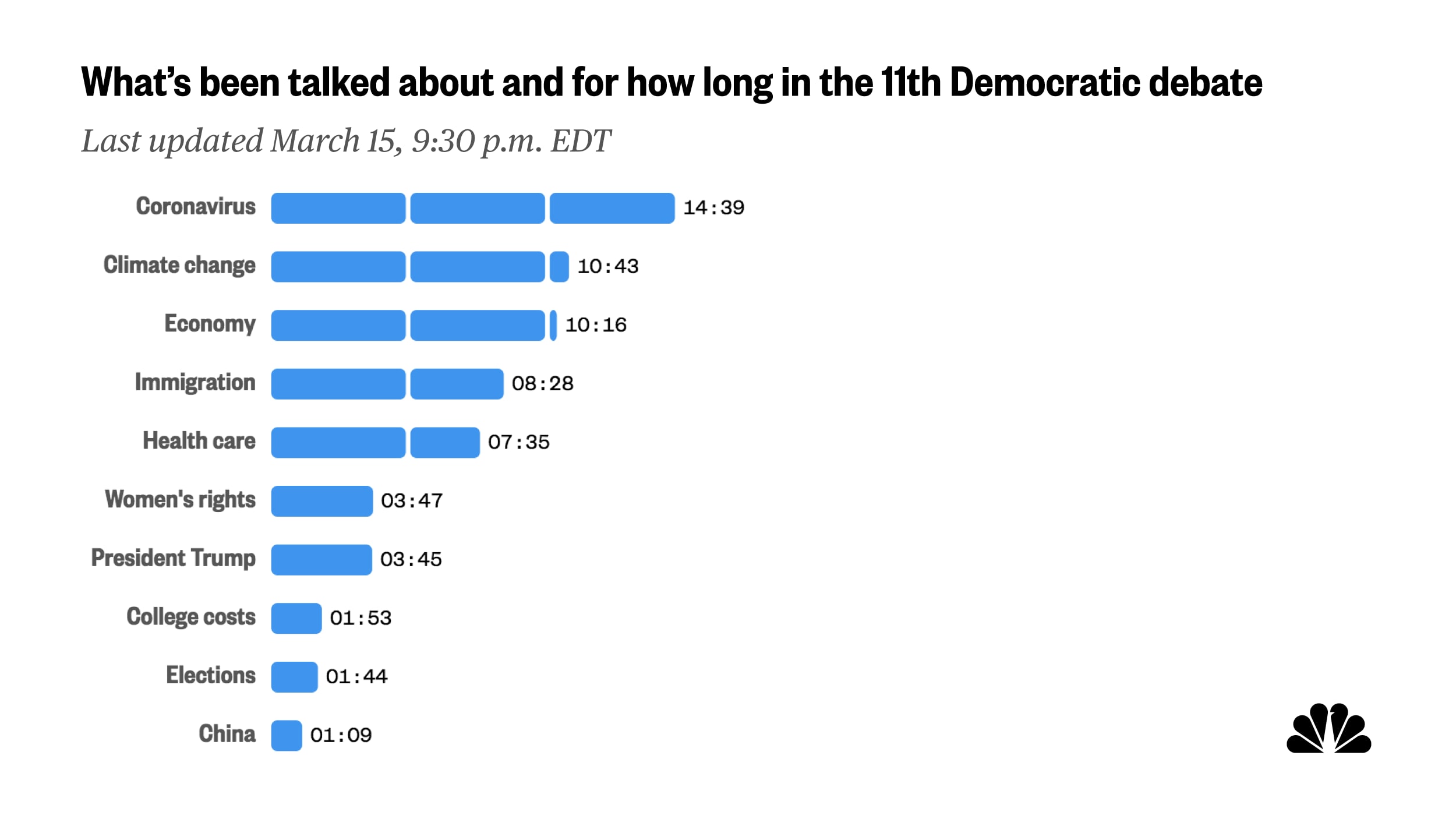 After spending more than 10 of the first 30 minutes talking about the coronavirus, the candidates moved onto other topics in the second half of the first hour of tonight's debate. See the full list of topics and how much time has been spent on each.
