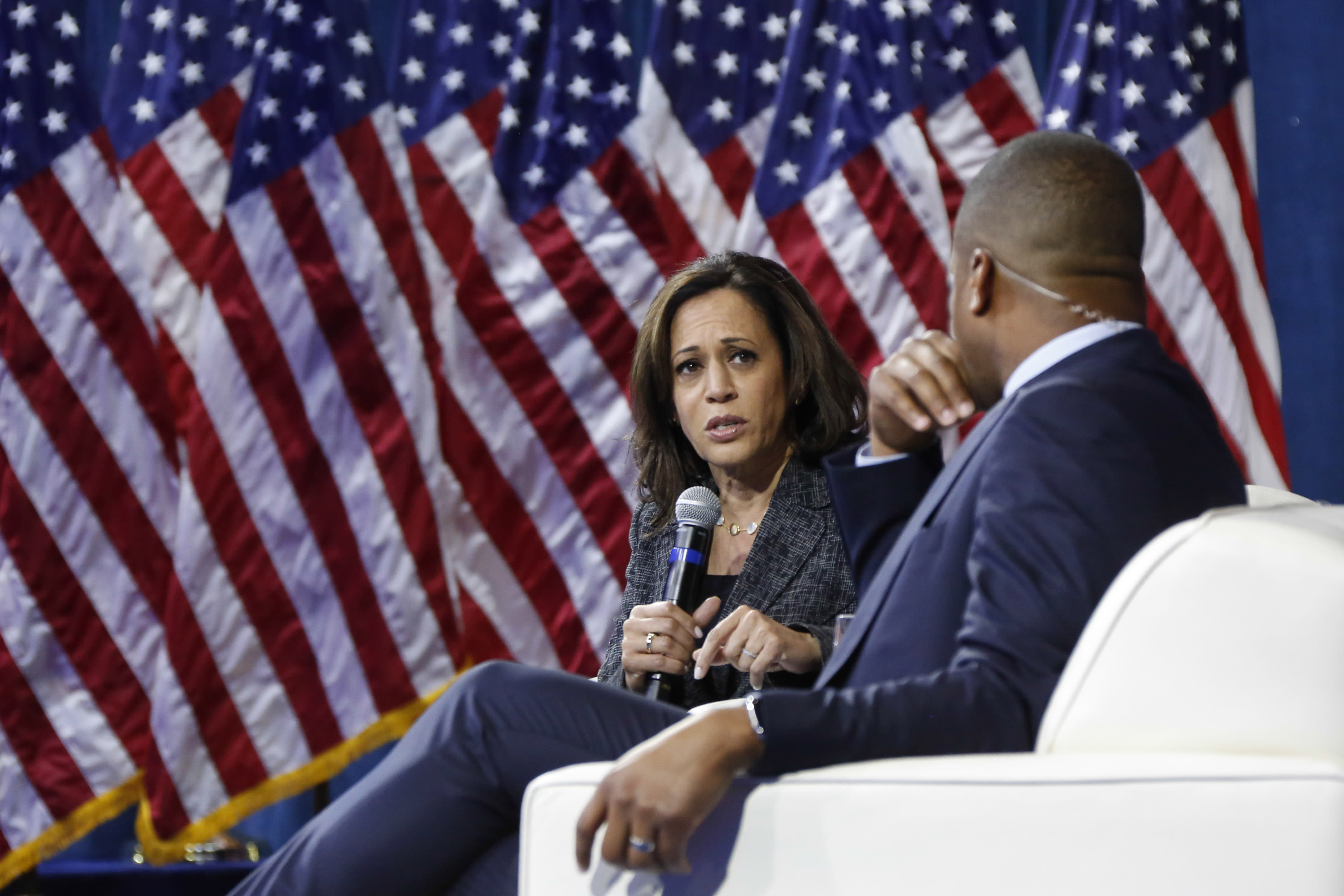 Answering a question about the prospect of demilitarizing police forces, Harris said she would stop supplying military surplus equipment to law enforcement. She also said that she would work to end mass incarceration, decriminalize and legalize marijuana and work aggressively on exonerations. As president, Harris said, she would use her experience as a former prosecutor to increase accountability in the criminal justice system for police and prosecutors for misconduct.
