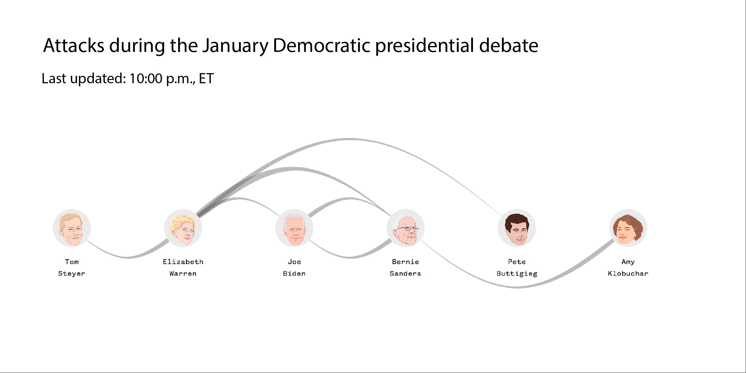 Hosted by CNN and the Des Moines Register, the debate featured six candidates: former Vice President Joe Biden, Sen. Bernie Sanders of Vermont, Sen. Elizabeth Warren of Massachusetts, Sen. Amy Klobuchar of Minnesota, billionaire Tom Steyer, and former Mayor Pete Buttigieg of South Bend, Indiana.