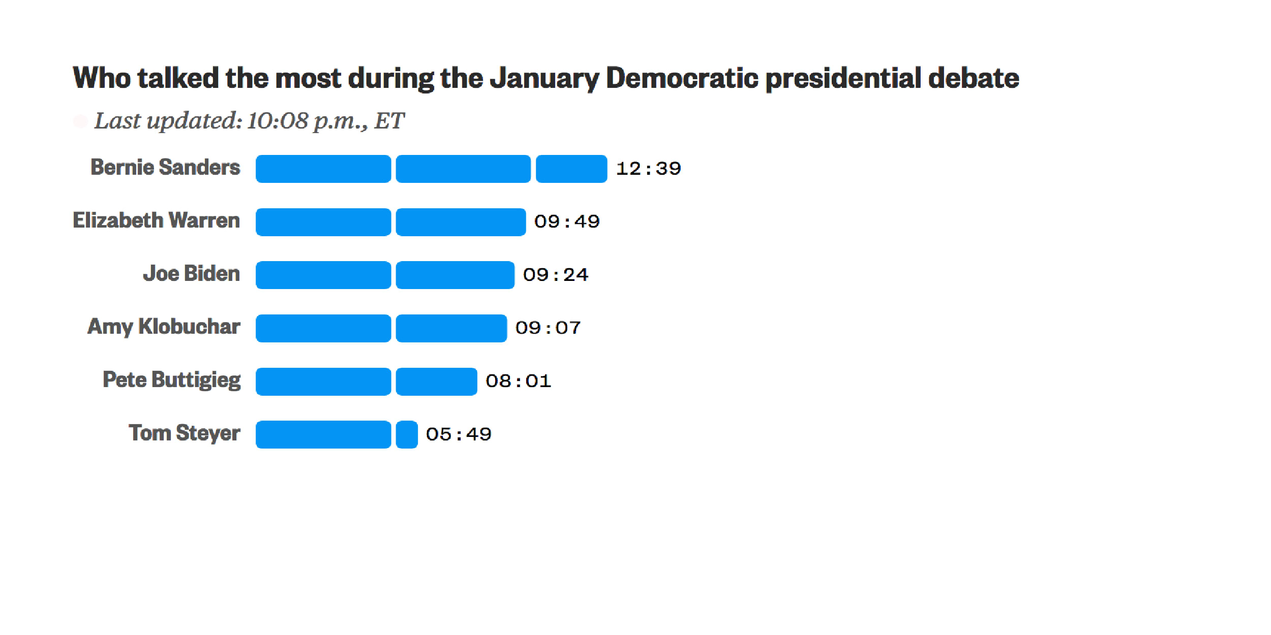 - Tom Steyer spoke the least, he had 10 minutes of talking time.