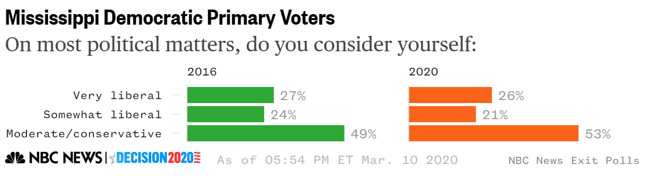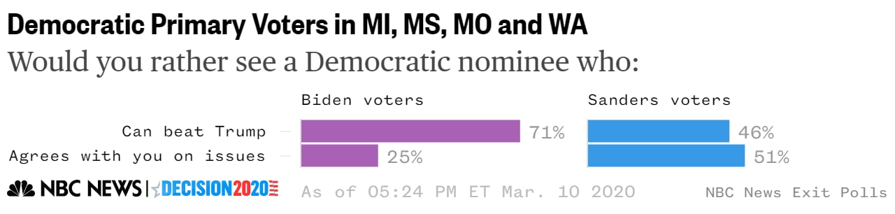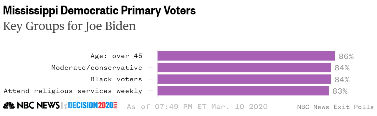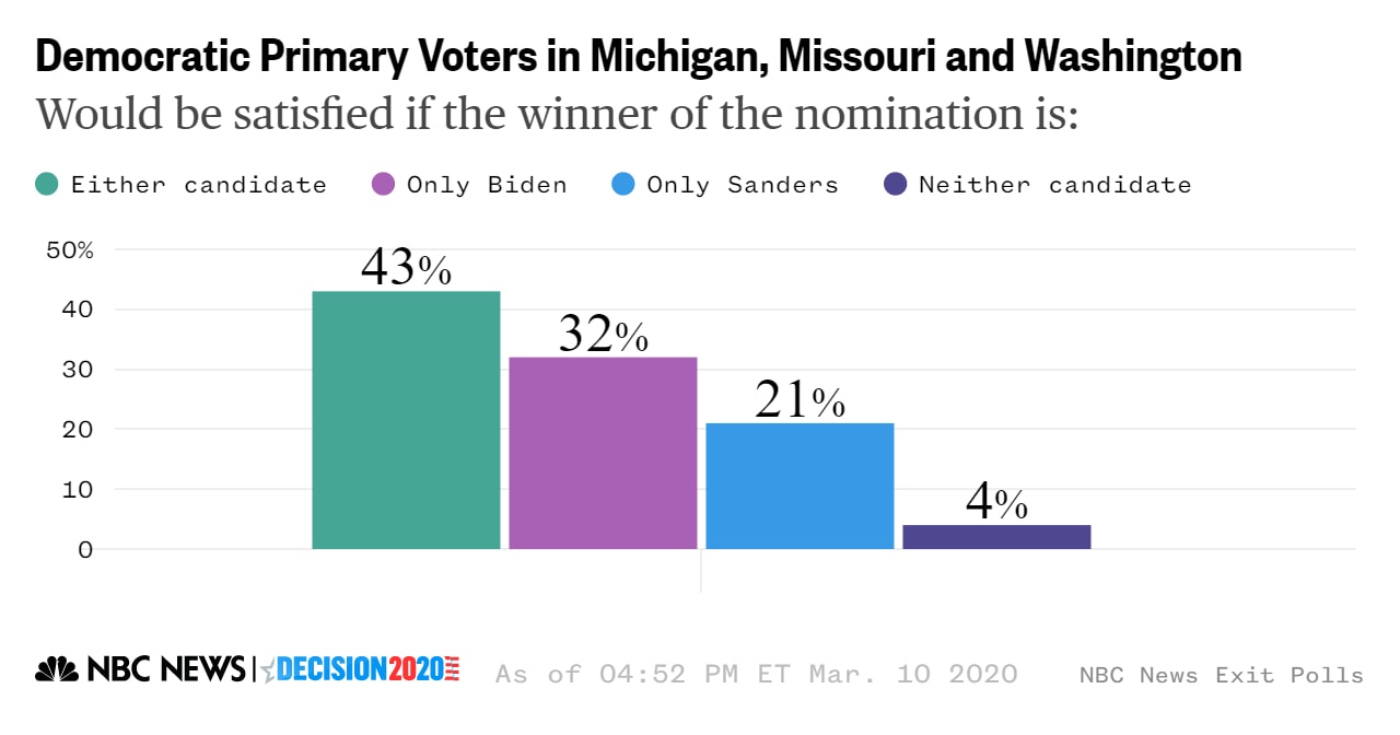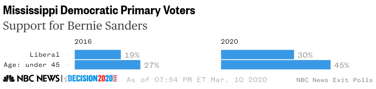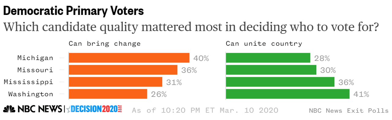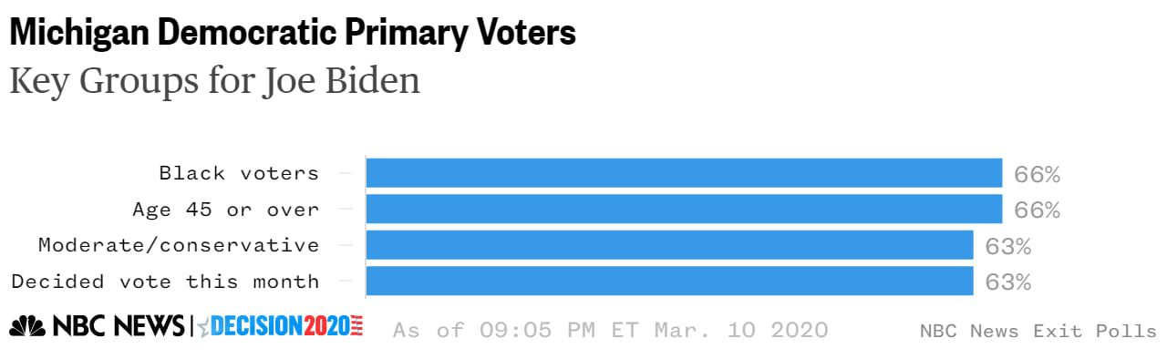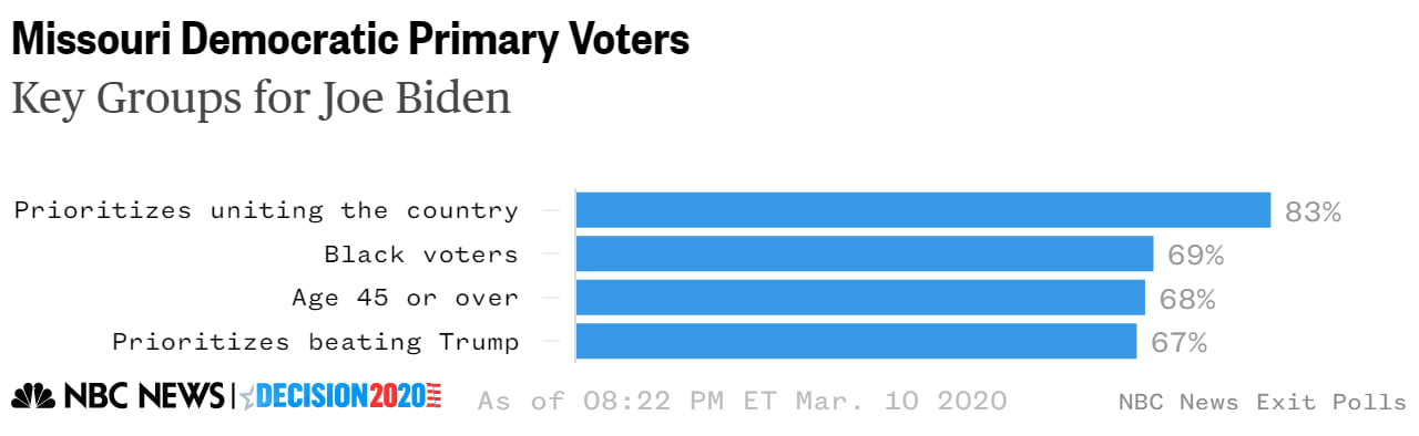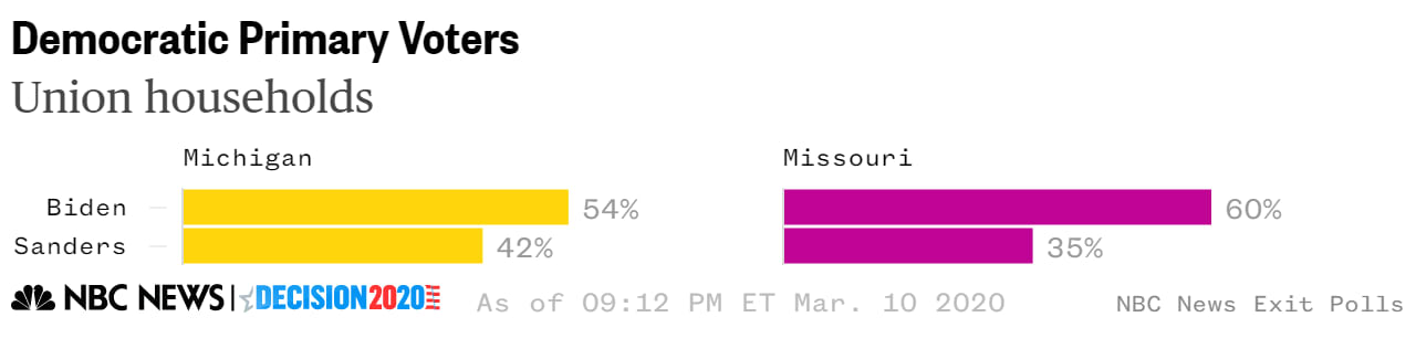 That’s the message from last night’s decisive Biden victories in Mississippi (where he’s ahead 81 percent to 14.8 percent), Missouri (60 percent to 35 percent), Michigan (53 percent to 37 percent) and even Idaho (49 percent to 43 percent). (NBC News’ Decision Desk says that Washington state, where Sanders is ahead by 2,000 votes with 69 percent in, is “too close to call,” and NBC just projected Sanders the winner of North Dakota’s caucuses).