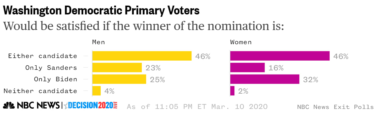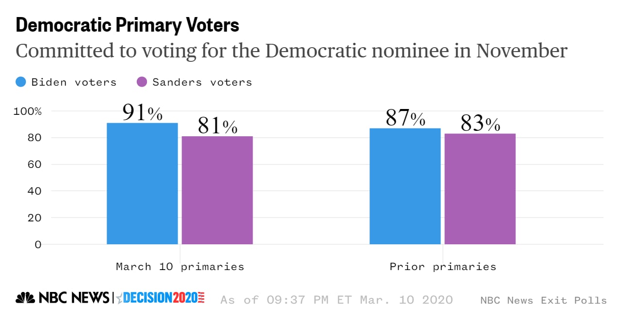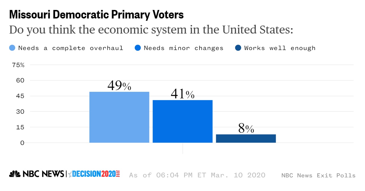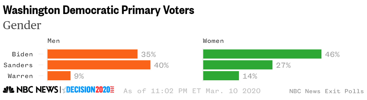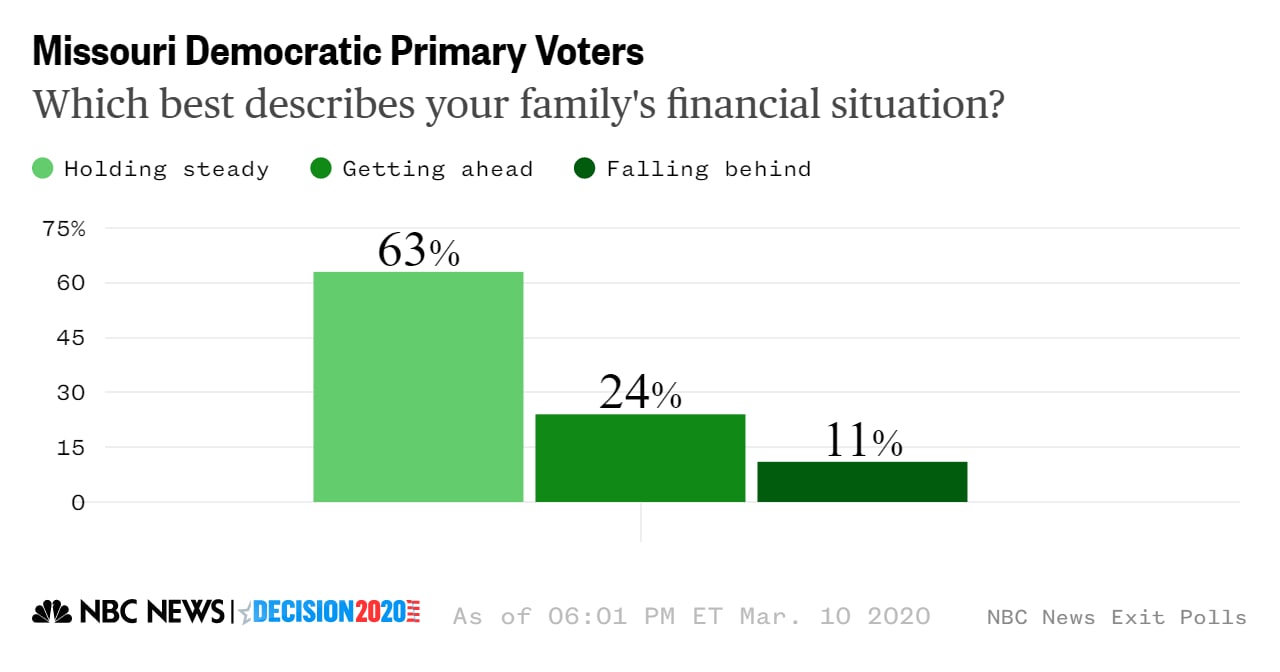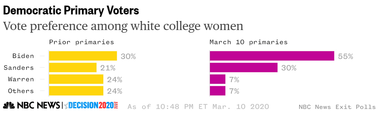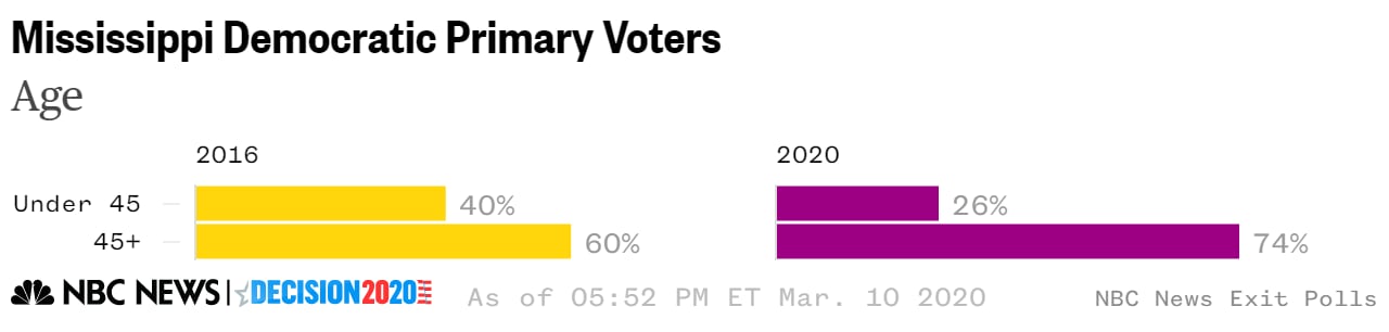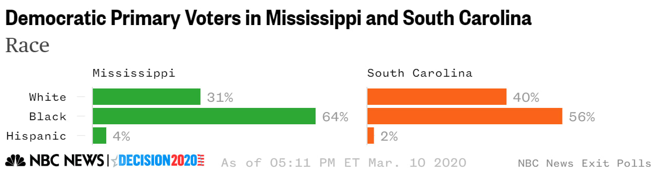 That’s the message from last night’s decisive Biden victories in Mississippi (where he’s ahead 81 percent to 14.8 percent), Missouri (60 percent to 35 percent), Michigan (53 percent to 37 percent) and even Idaho (49 percent to 43 percent). (NBC News’ Decision Desk says that Washington state, where Sanders is ahead by 2,000 votes with 69 percent in, is “too close to call,” and NBC just projected Sanders the winner of North Dakota’s caucuses).
