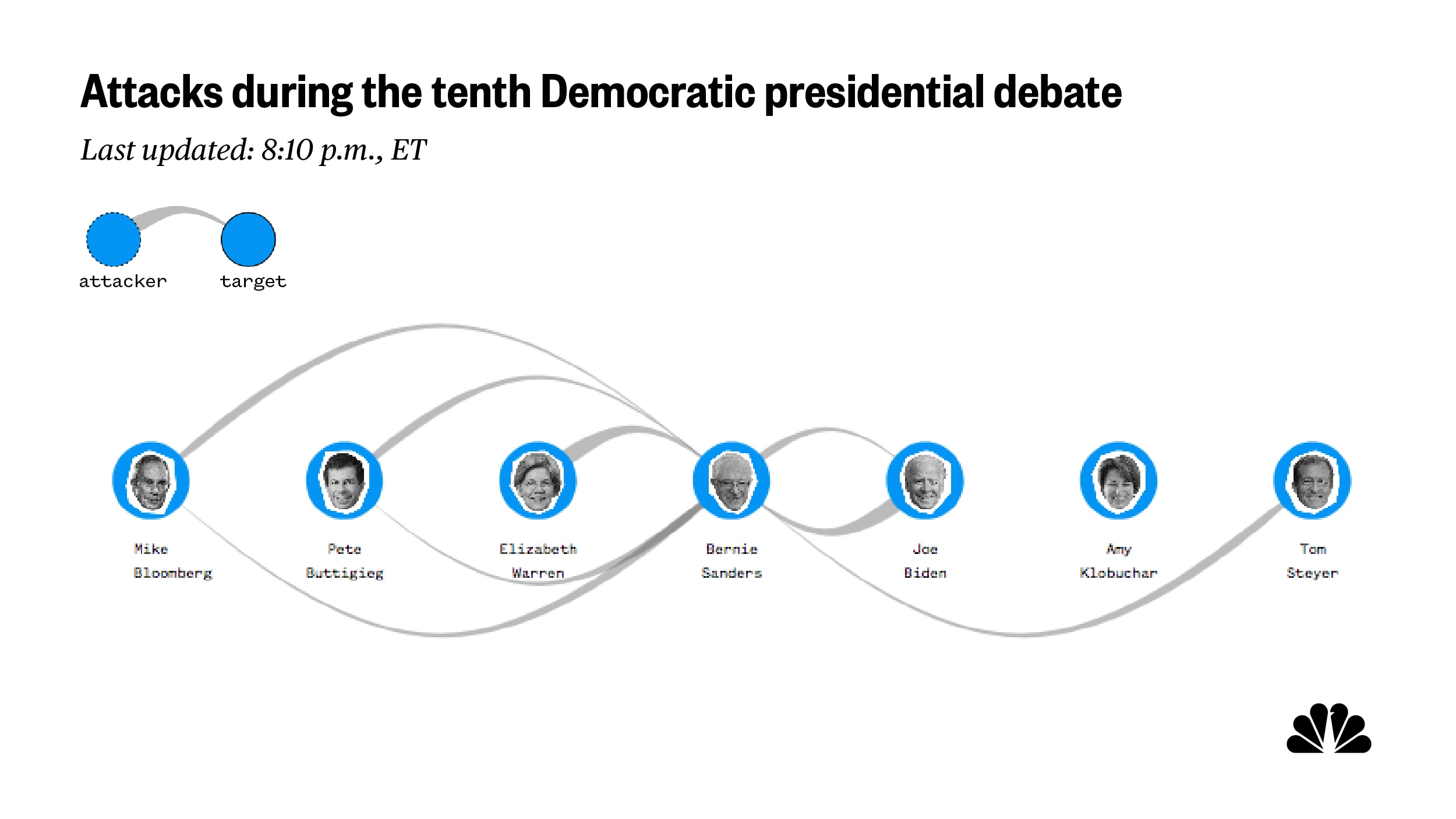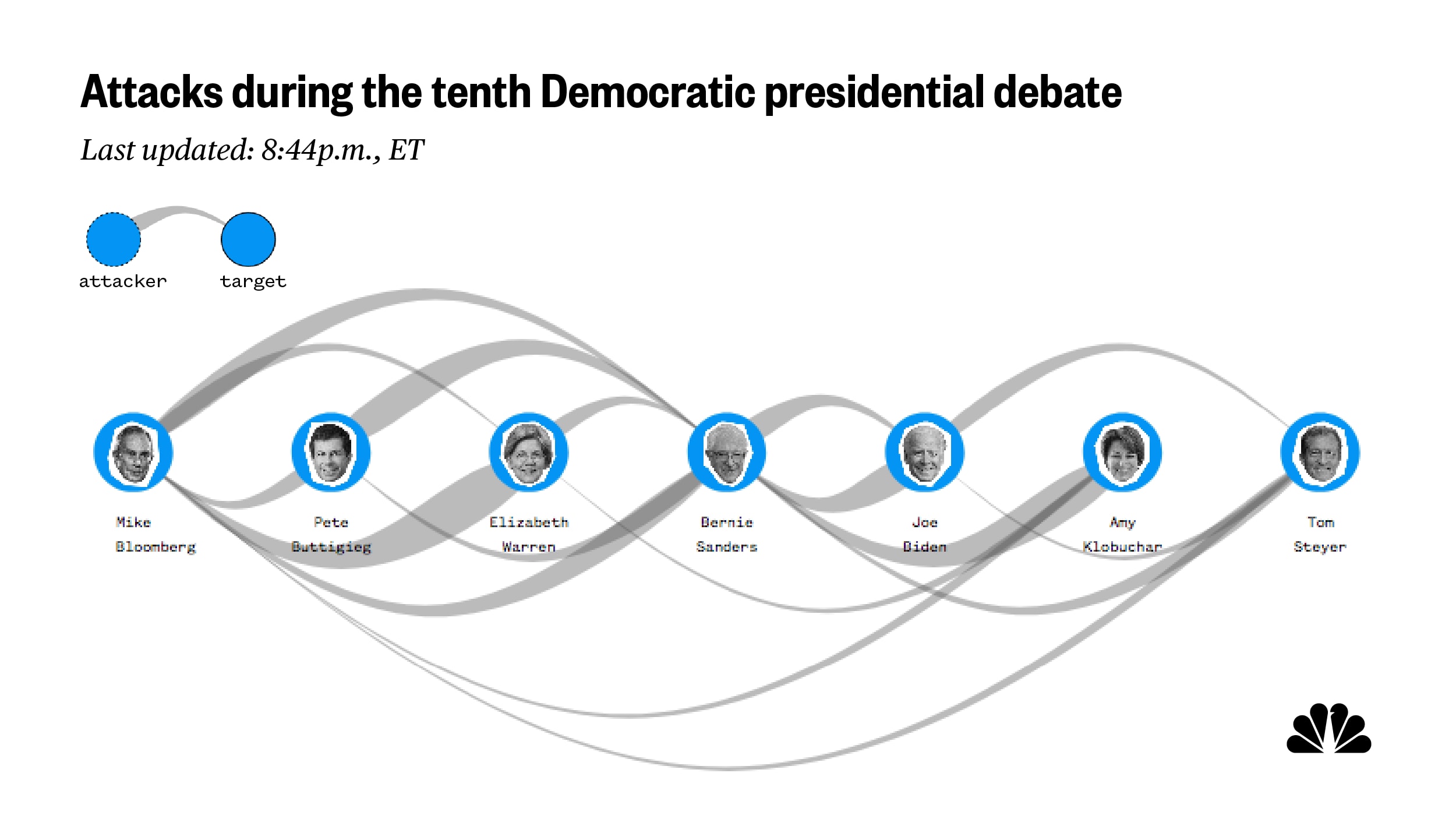 The 33 attacks on Sanders were beaten only by the 45-attack battery that Bloomberg received last week. This week, Bloomberg was attacked often but not as often, totaling 17 attacks, almost half of them at the hands of Warren.