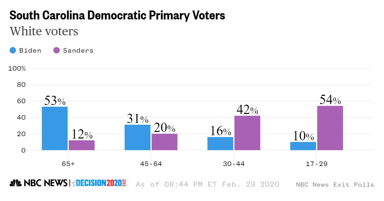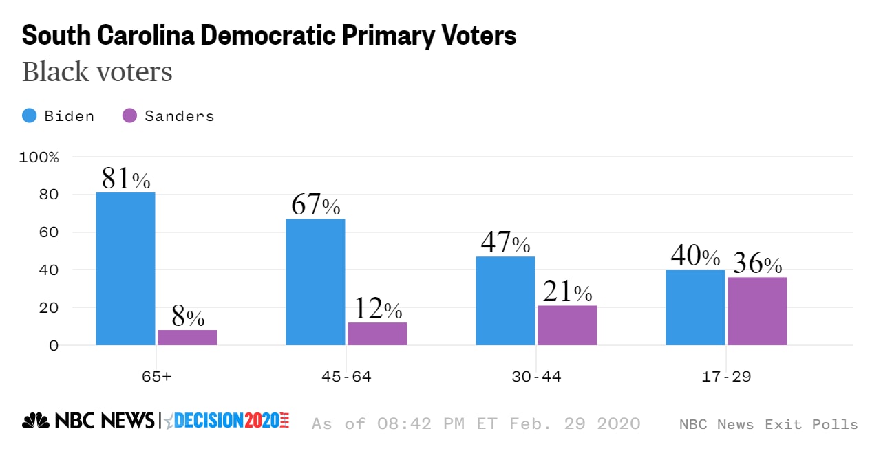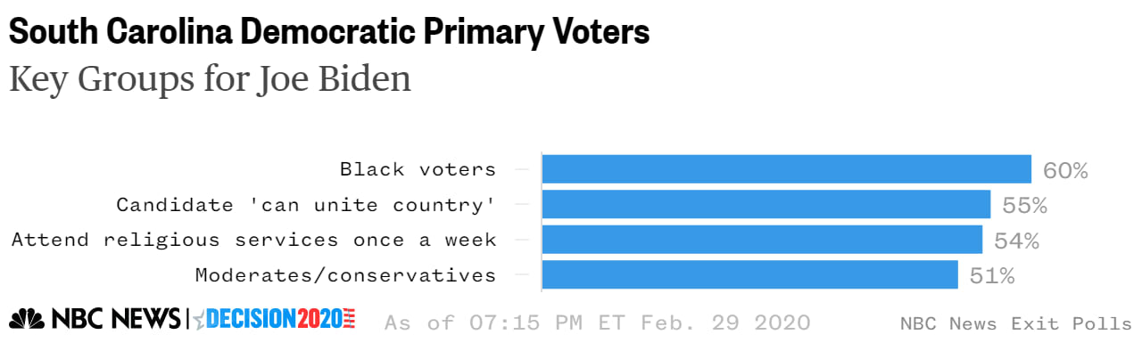 NBC News projects former Vice President Joe Biden has won the South Carolina primary with heavy support from black and moderate voters.