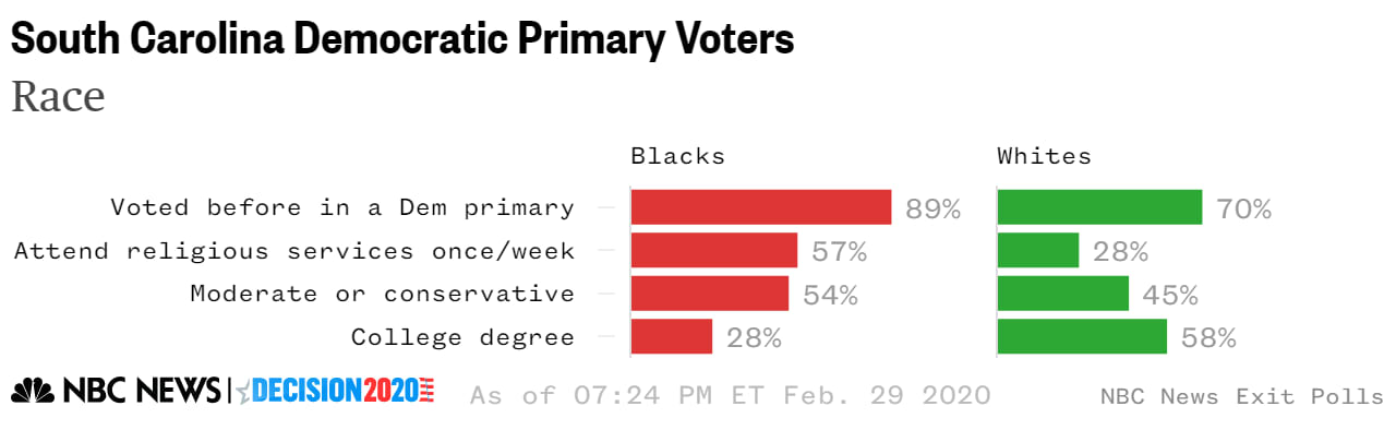 Today’s South Carolina Democratic primary features an electorate that differs sharply in many ways from the previous three early voting states in the 2020 race, early results from the NBC Exit Poll show.