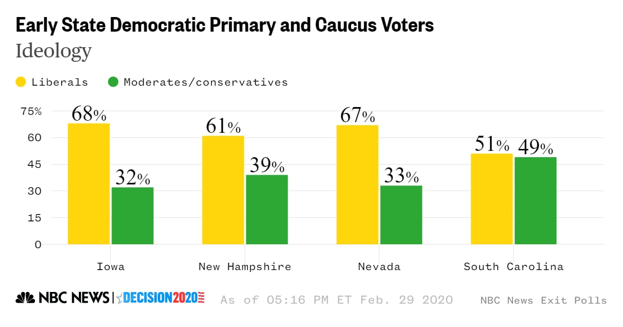More than half of those voting in South Carolina identify as African American, a share dramatically higher than in the Iowa, New Hampshire or Nevada 2020 Democratic contests. Just half of voters consider themselves to be liberal; in all previous states liberals made up at least six in 10 voters. And just four in 10 South Carolina voters today hold a college degree. By contrast, college graduates were the majority of electorates in the first three contests.