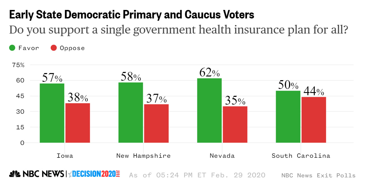 A proposal to replace all private insurance with a single government plan for all Americans is finding majority support among voters in all four early state Democratic presidential contests, results from the NBC News Exit Poll show.
