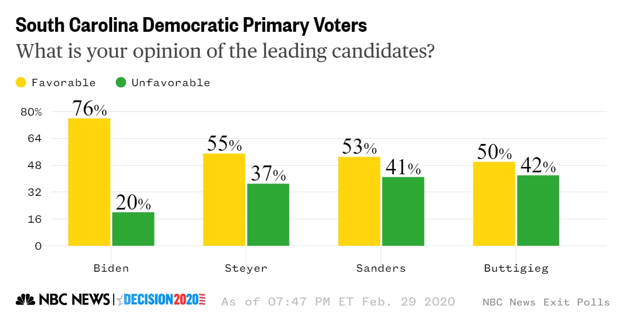The NBC News exit poll found that Biden won 64 percent of the black vote, followed by Sanders with 15 percent, Steyer with 13 percent, and Warren with 4 percent. The exit poll said South Carolina’s electorate is 57 percent African American, the first majority-black primary on the calendar.