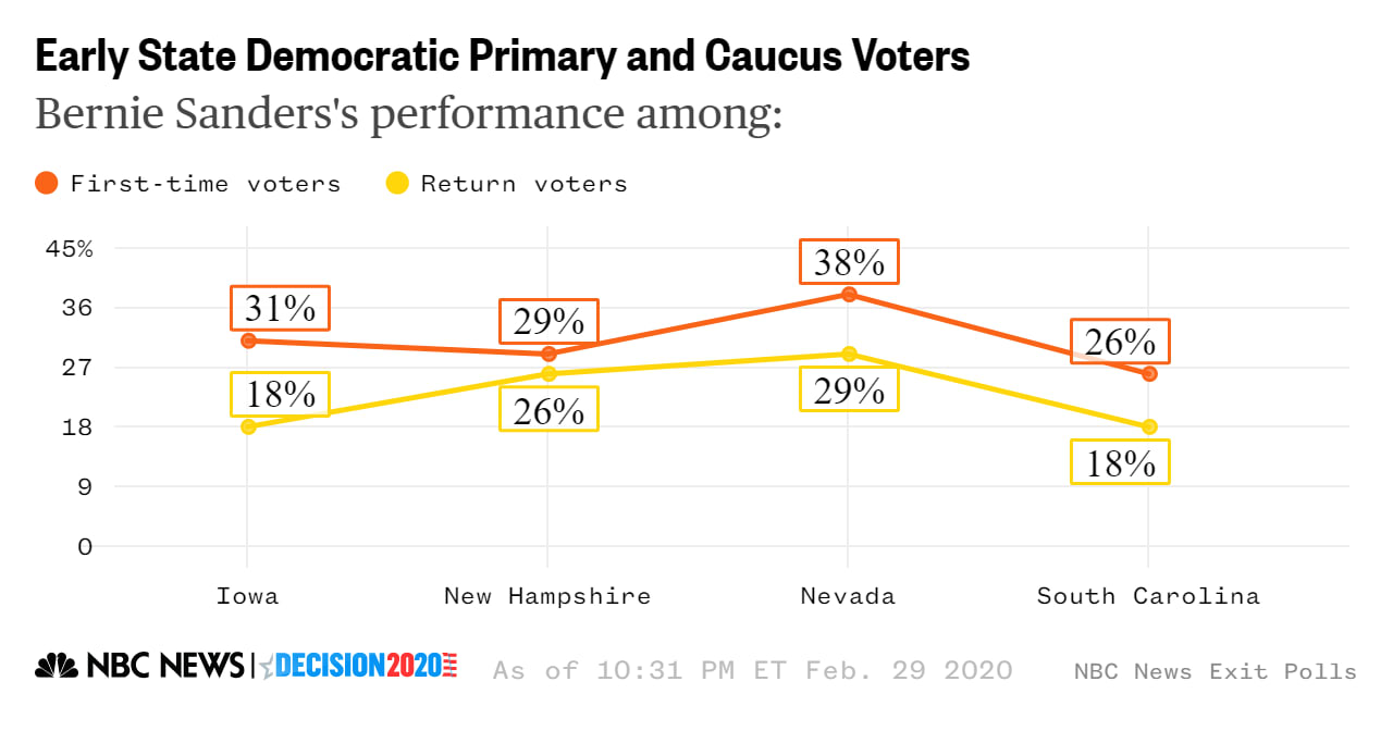 They are the only candidates remaining in the race to consistently over-perform with first-time voters in the early state Democratic nomination contests in Iowa, New Hampshire, and Nevada, suggesting that they both are unusually successful at attracting new voters to the polls.