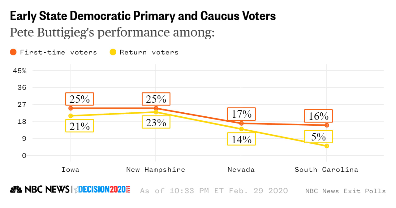 Sanders' and Buttigieg's performances were stronger among first-time voters than among return voters in the South Carolina Democratic presidential primary, according to the NBC News Exit Poll.