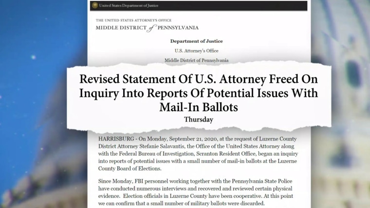 In a highly unusual move Thursday, David Freed, the U.S. Attorney for the Middle District of Pennsylvania, issued a statement saying his office had begun "an inquiry into reports of potential issues with a small number of mail-in ballots at the Luzerne County Board of Elections." The release also noted that at least seven of the nine ballots were "cast for presidential candidate Donald Trump."