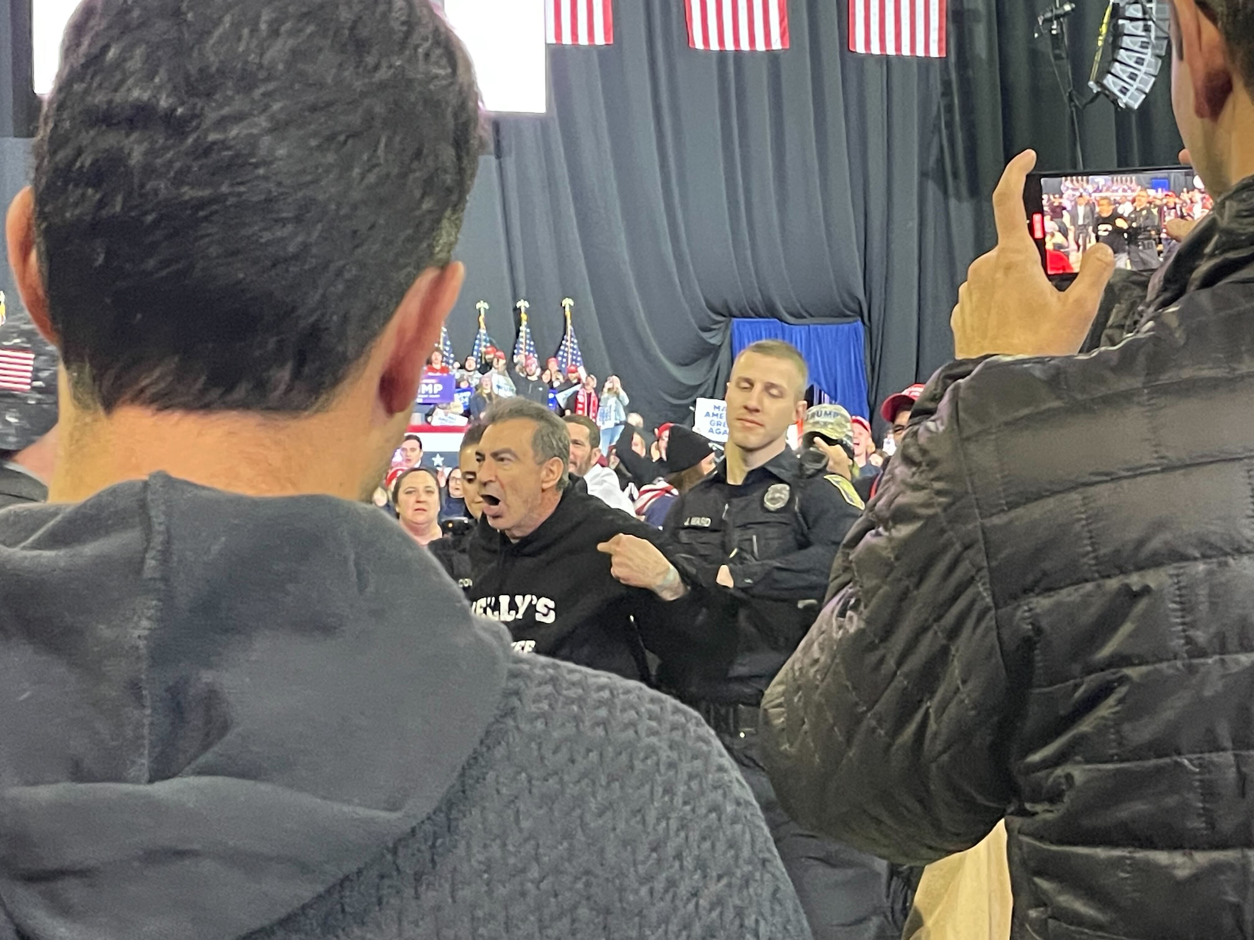 A protester is escorted out of a rally for former President Donald Trump on Jan. 20, 2024. Amanda Terkel