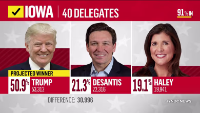 Trump, Haley and DeSantis have each ticked up by one delegate. Trump now leads with 17 delegates, while Haley and DeSantis trail behind with five delegates each, according to an NBC News tally. Ramaswamy has also obtained one delegate. That’s with 6% of the vote in.