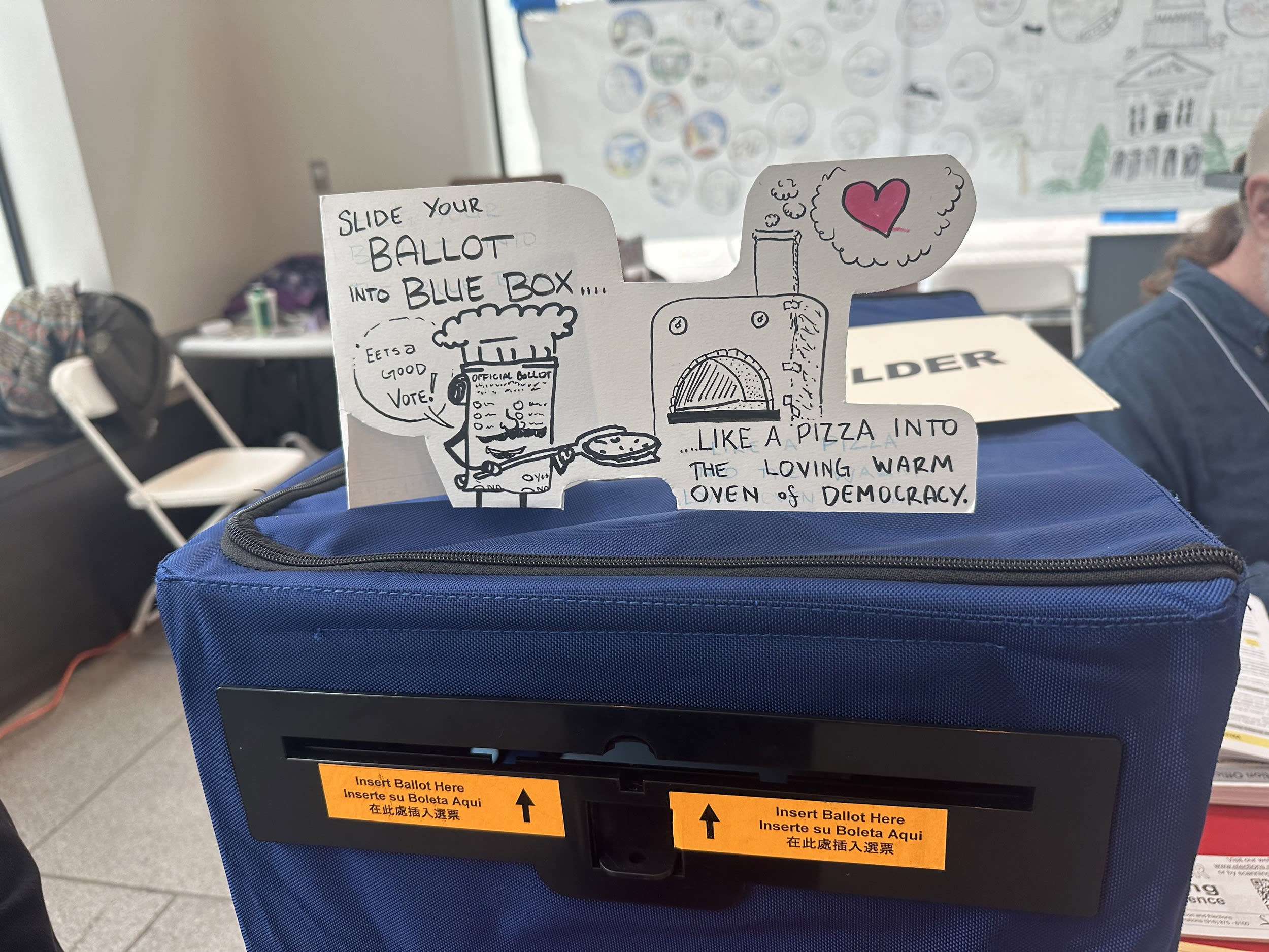 The polling location at the California Museum in Sacramento will feature not just VIP drop-ins from Gov. Gavin Newsom and the mayor, Darrell Steinberg, but the election inspector of this location, Eben Burgoon, is a cartoonist. He has done election day-themed drawings that are posted throughout the polling location. The cartoon atop the ballot box reads, “Slide your ballot into blue box ... like a pizza into the loving warm oven of Democracy.”