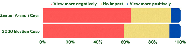 Over half of those surveyed — 64% — said that the fact that Trump “was recently found liable of sexual assault and defamation and ordered to pay over $80 million to the victim by a jury” makes them view him more negatively.