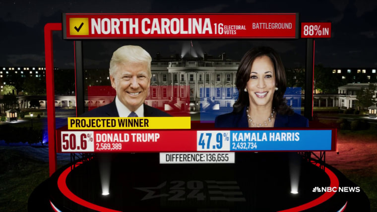 Former President Donald Trump has won North Carolina, NBC News projects, taking the first major major battleground of the election so far and cementing the GOP’s hold on the state’s 16 electoral votes.