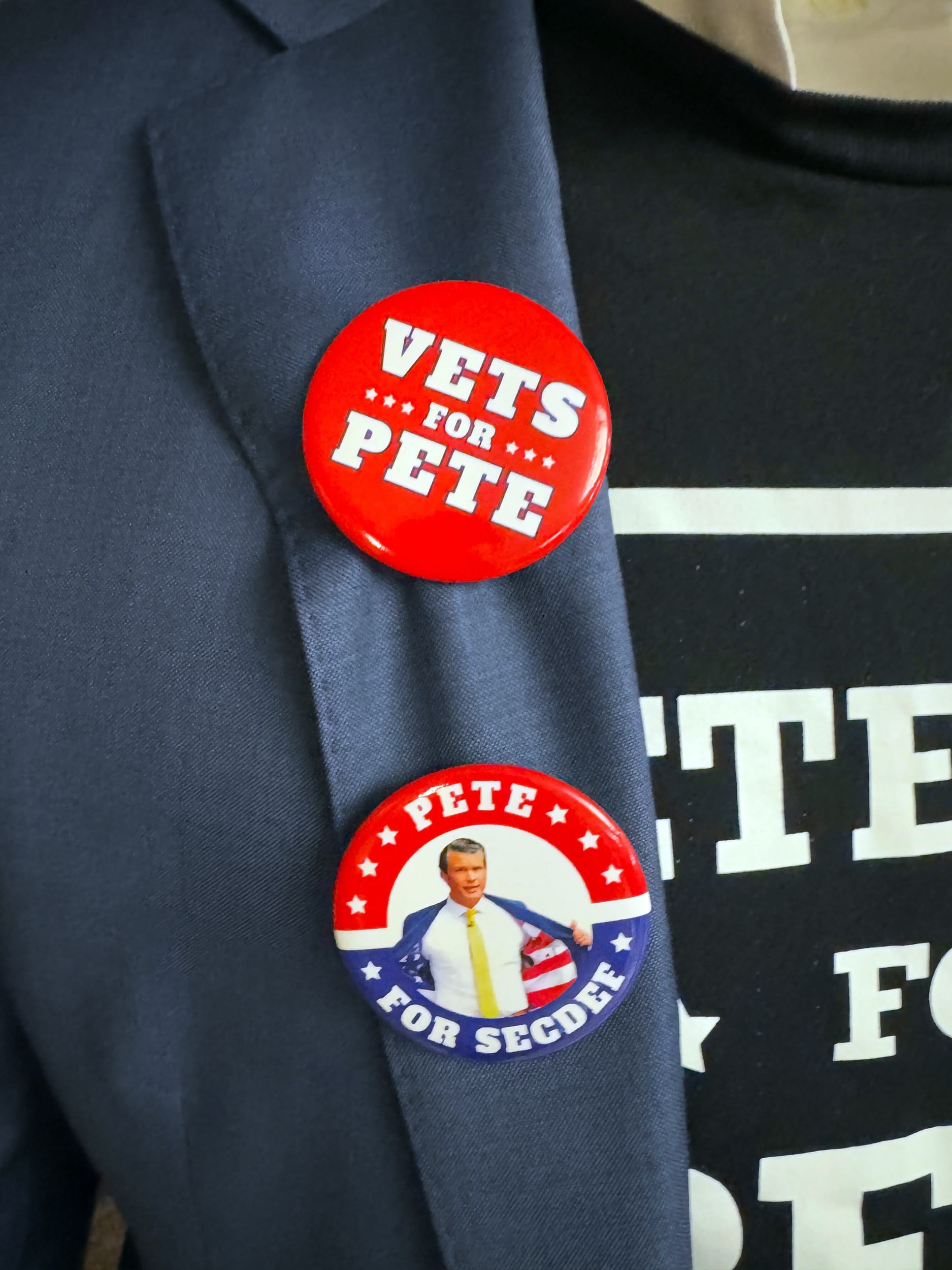 A group of veterans wearing pins supporting Hegseth have gathered outside the Senate confirmation hearing room.
