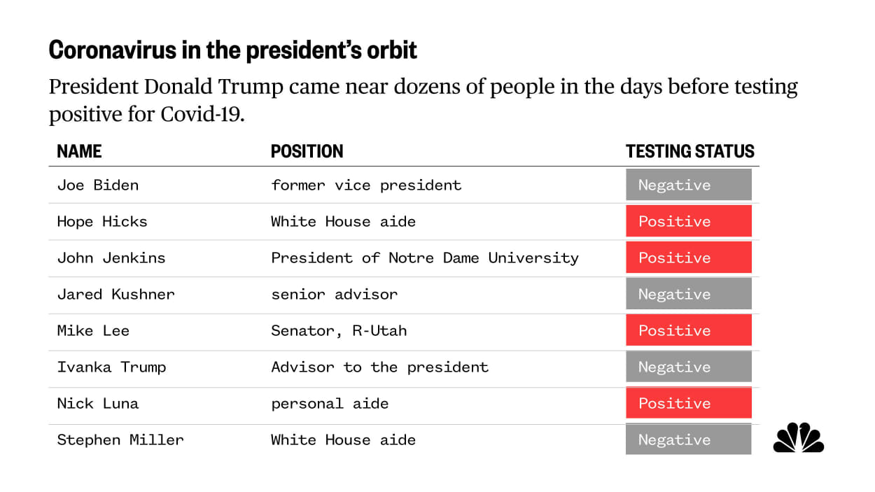 NBC News is tracking the declared infection status of those who came into contact with Trump in the last few days. See the full list here.
