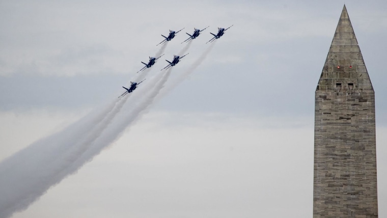 The Army provided the fifth flyover made up of four Apache helicopters, with the Navy Blue Angels aerial acrobatics team finishing the display with six F-18 Hornets.