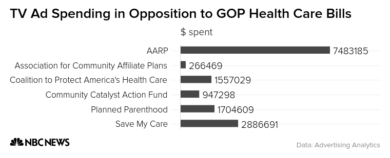 About half the spending to date — $7.5 million — has come from the retirees advocacy group AARP. One of the most vociferous opponents of the GOP bills, AARP has promised to print every senator’s vote in its bulletin, which the group says is read by over 30 million people.