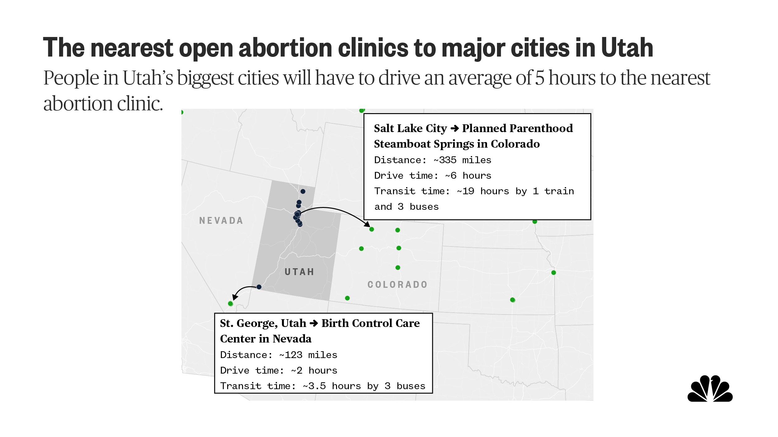NBC News analyzed the distance to the nearest open abortion clinic from major cities in 21 states that either have pre-existing or pending state-level abortion bans that will go into effect following the Supreme Court’s ruling Friday to overturn Roe. Women and girls there will have to drive 4 hours on average in order to receive care in bordering states where abortion remains legal.