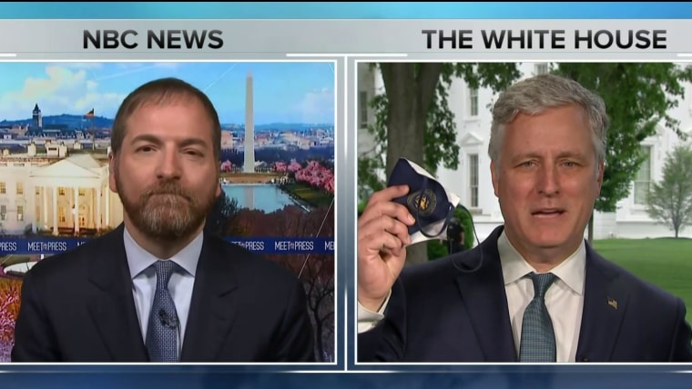 Robert O’Brien, Trump’s national security adviser, told “Meet the Press” Sunday that he and many other members of the White House staff wear masks during work and hope that will set an “example” for Americans looking to return to the office. And he defended the president’s conduct by arguing that if proper social-distancing measures are taken, Trump doesn’t always need to wear a mask.