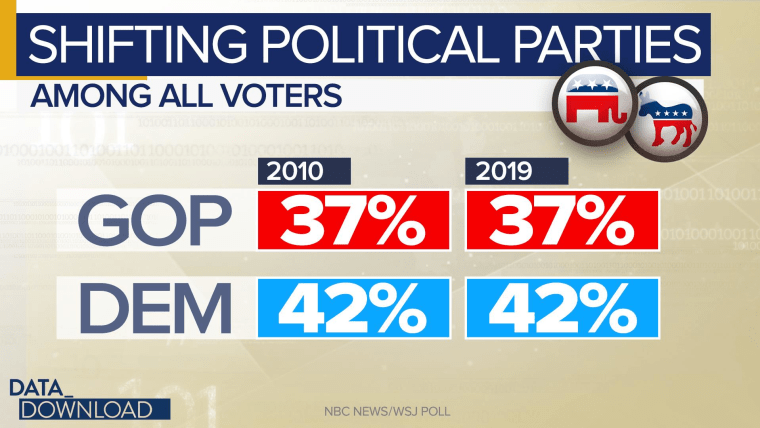 In 2010, the NBC News-Wall Street Journal poll found that 42 percent of registered voters identified as Democrats, while 37 percent identified as Republicans. At the end of 2019, the figures showed 42 percent were Democrats and 37 percent were Republicans. Unchanged.