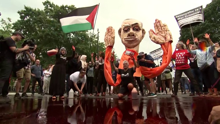 A smaller group of protesters returned Thursday to demonstrate outside the White House, where Netanyahu met separately with President Joe Biden and Vice President Kamala Harris.