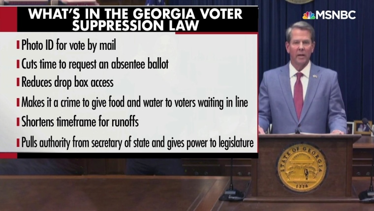 Georgia Democrat Stacey Abrams, the founder of voting rights group Fair Fight, said in a statement that the law was "blatantly unconstitutional" and "nothing less than Jim Crow 2.0."
