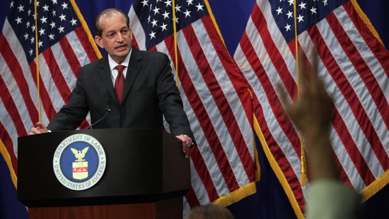 The labor secretary's role in the administration has come under scrutiny after Epstein, 66, was arrested over the weekend and charged Monday with sex trafficking of minors in New York and Florida from at least 2002 through 2005. Epstein has pleaded not guilty to the charges.