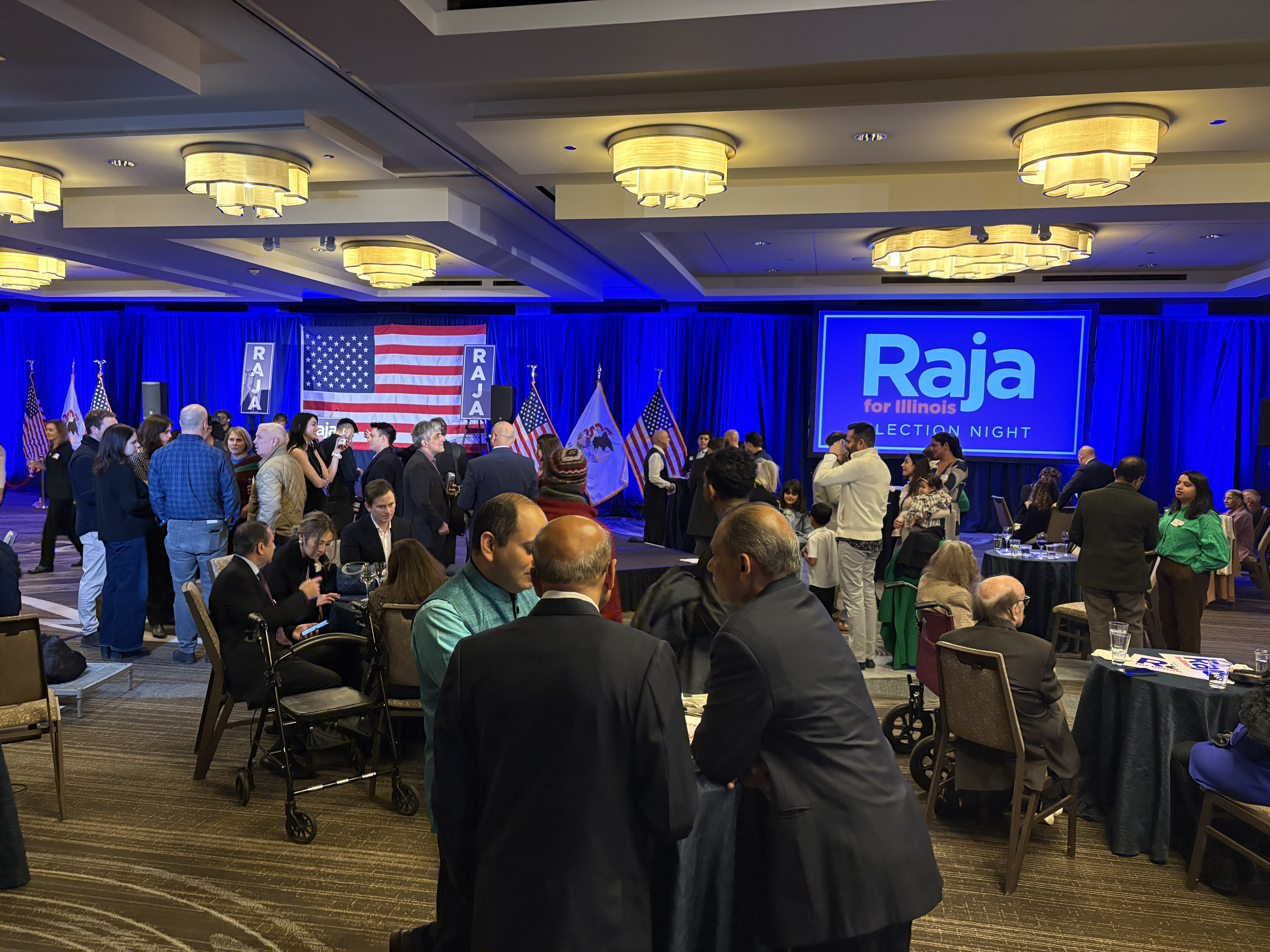Here at Rep. Raja Krishnamoorthi’s watch party, live election results from the local news on the screen next to the stage have been replaced by the campaign logo. There’s no notable shift in mood among the supporters here as Lt. Gov. Juliana Stratton performs well with about 67% of the vote in.