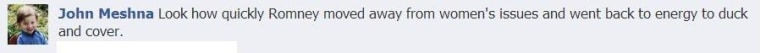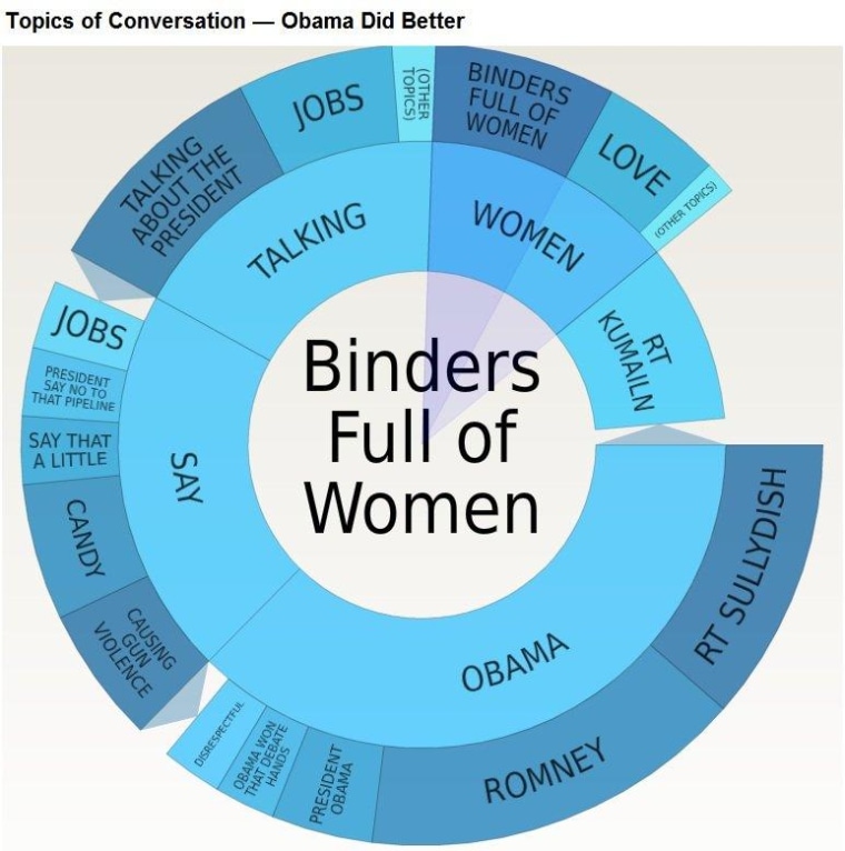 Romney was sharply criticized for his comments on equal opportunities for women, a topic that has been a consistent drag on his appeal since NBC Politics began tracking social media sentiment in the presidential campaign in February. Commenters particularly believed that Romney stumbled badly in asserting the he had reviewed "binders full of women" when assembling his Cabinet when he became governor of Massachusetts in 2003: