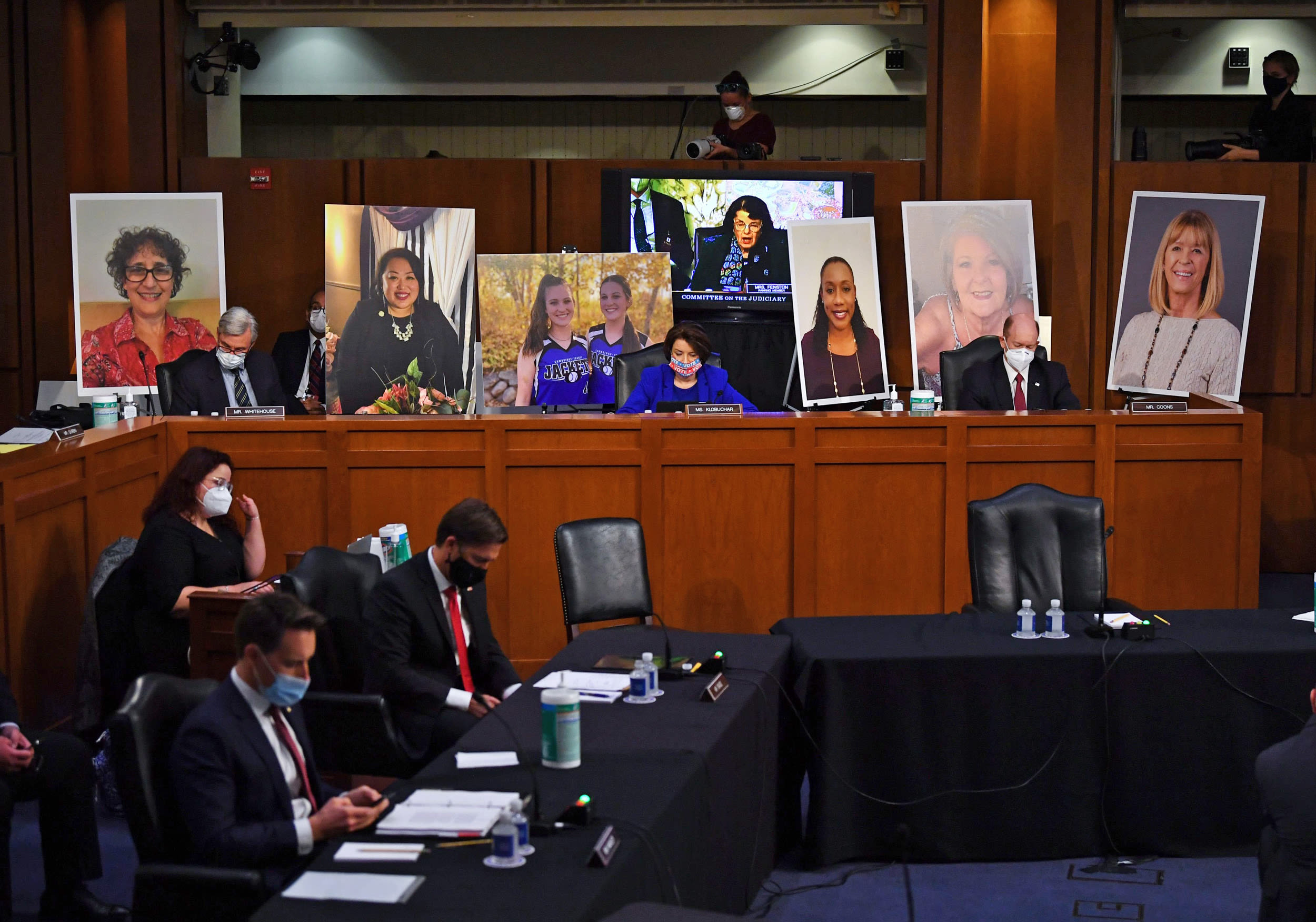 Sen. Amy Klobuchar, D-Minn., listens as Sen. Dianne Feinstein, D-Calif., speaks onscreen during a confirmation hearing for Supreme Court nominee Amy Coney Barrett. Kevin Dietsch / Pool via AFP - Getty Images