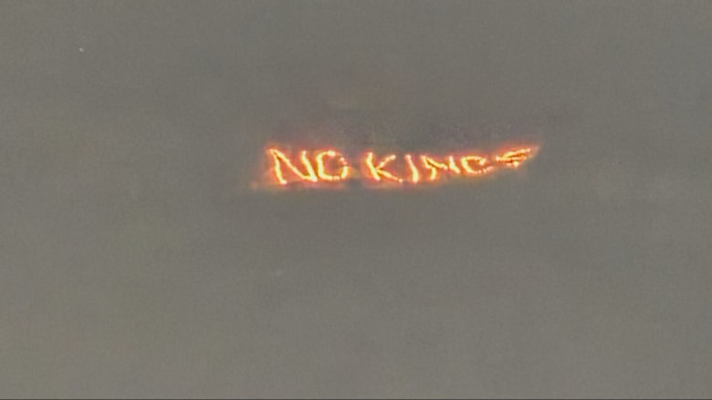 An illuminated ‘No Kings’ sign is raised in the sky outside the 56th annual World Economic Forum meeting in Davos, late last night.