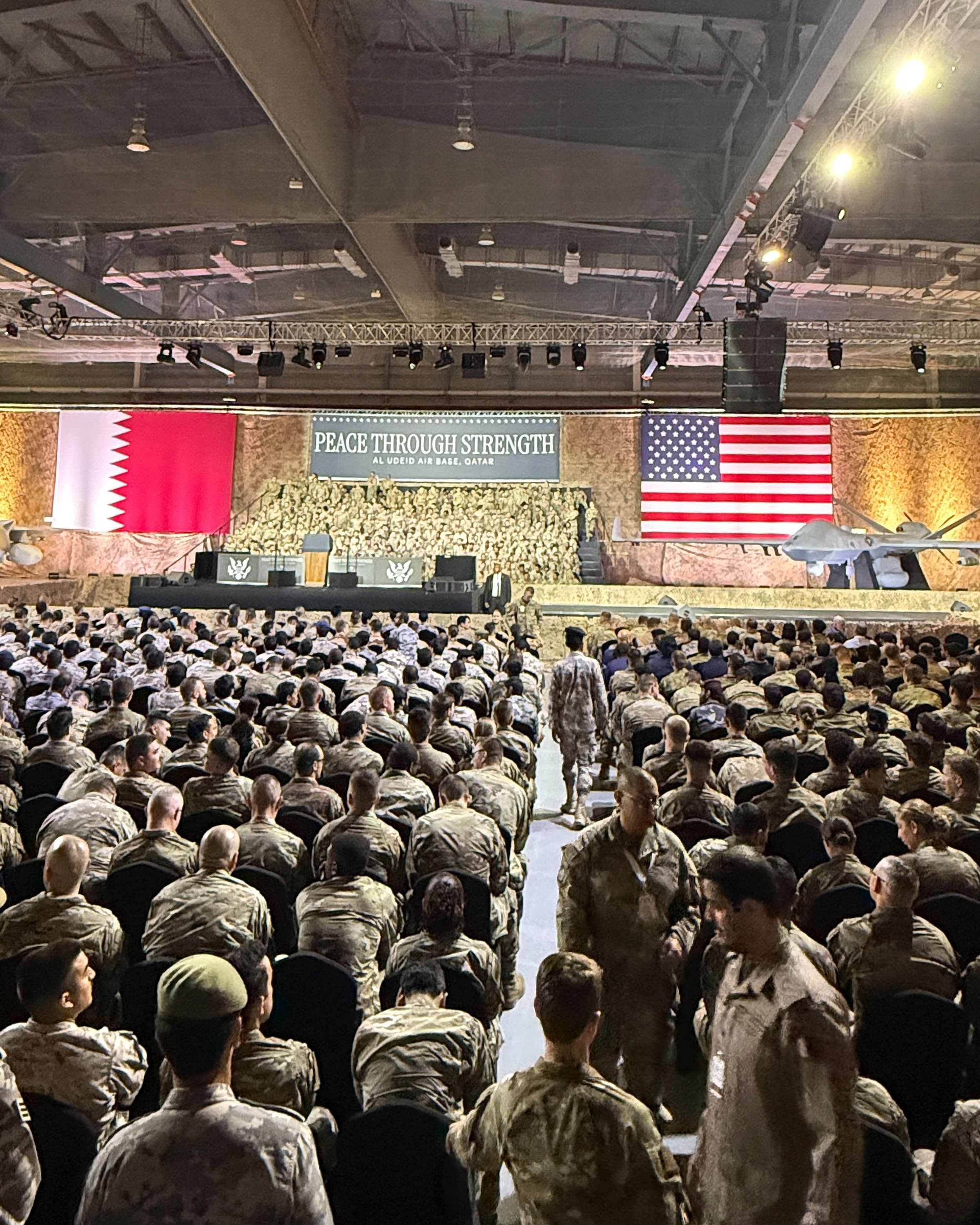 The president will give remarks to troops in a hangar in Al Udeid, the biggest U.S. military facility in the Middle East, later this morning against a backdrop that reads “Peace Through Strength.” “Eye of the Tiger” and other campaign rally favorites are playing.