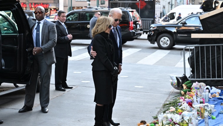 The Bidens stopped at Bourbon Street in the afternoon. Jill Biden laid flowers at a memorial honoring the victims, and they both stood quietly with their heads bowed.