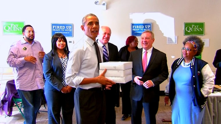 President Obama visits Governor Pat Quinn’s campaign headquarters in Chicago, Illinois, Monday.
