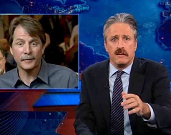 So Stewart stepped in by donning a mustache and riffing on Foxworthy's routine: "If you have a car on your front lawn because your garage only holds five cars.... If you go to the diner and order your eggs Faberge.... If you think 'Cloverfield' was a movie about your butler, you might be a Romney!"