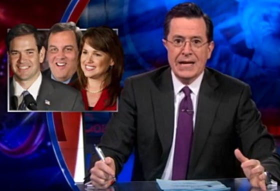 "Get Bobby Jindal a fake ID if he isn’t 35 yet!" Colbert suggested. Others he’d like to see in the race? New Jersey Governor Chris Christie or Florida Senator Marco Rubio. Colbert said he’ll even take “that lady who’s not a witch.” (That is Delaware’s Christine O’Donnell). Facing the harsh reality that Mitt might be it for Republicans, Colbert started the Countdown to Loving Mitt Clock.
