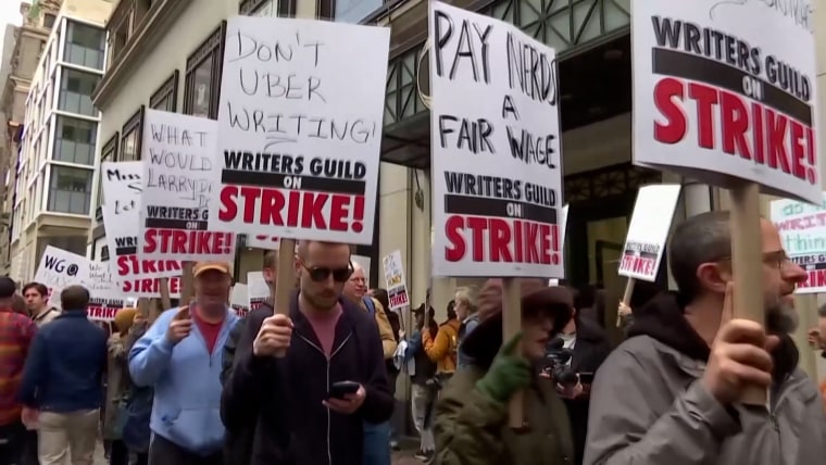 The unions representing Hollywood’s striking screenwriters and actors remain miles apart from the big studios on key issues, meaning that the majority of entertainment productions are still on hold and most rank-and-file members remain out of work. The battle pits the two unions — the Writers Guild of America and the actors guild, SAG-AFTRA — against the Alliance of Motion Picture and Television Producers, a trade group that bargains for the major studios and streaming services. (The group represents NBCUniversal, the parent company of NBC News.)
