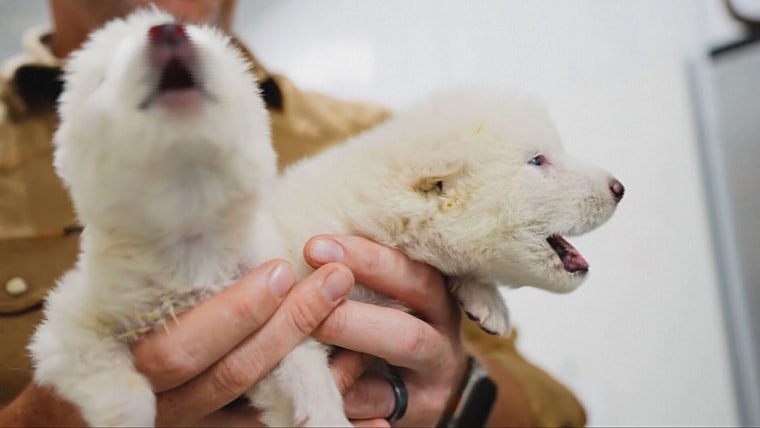 Then the scientists took blood cells from a living gray wolf and used CRISPR to genetically modify them in 20 different sites, said Colossal’s chief scientist Beth Shapiro. They transferred that genetic material to an egg cell from a domestic dog. When ready, embryos were transferred to surrogates, also domestic dogs, and 62 days later the genetically engineered pups were born.