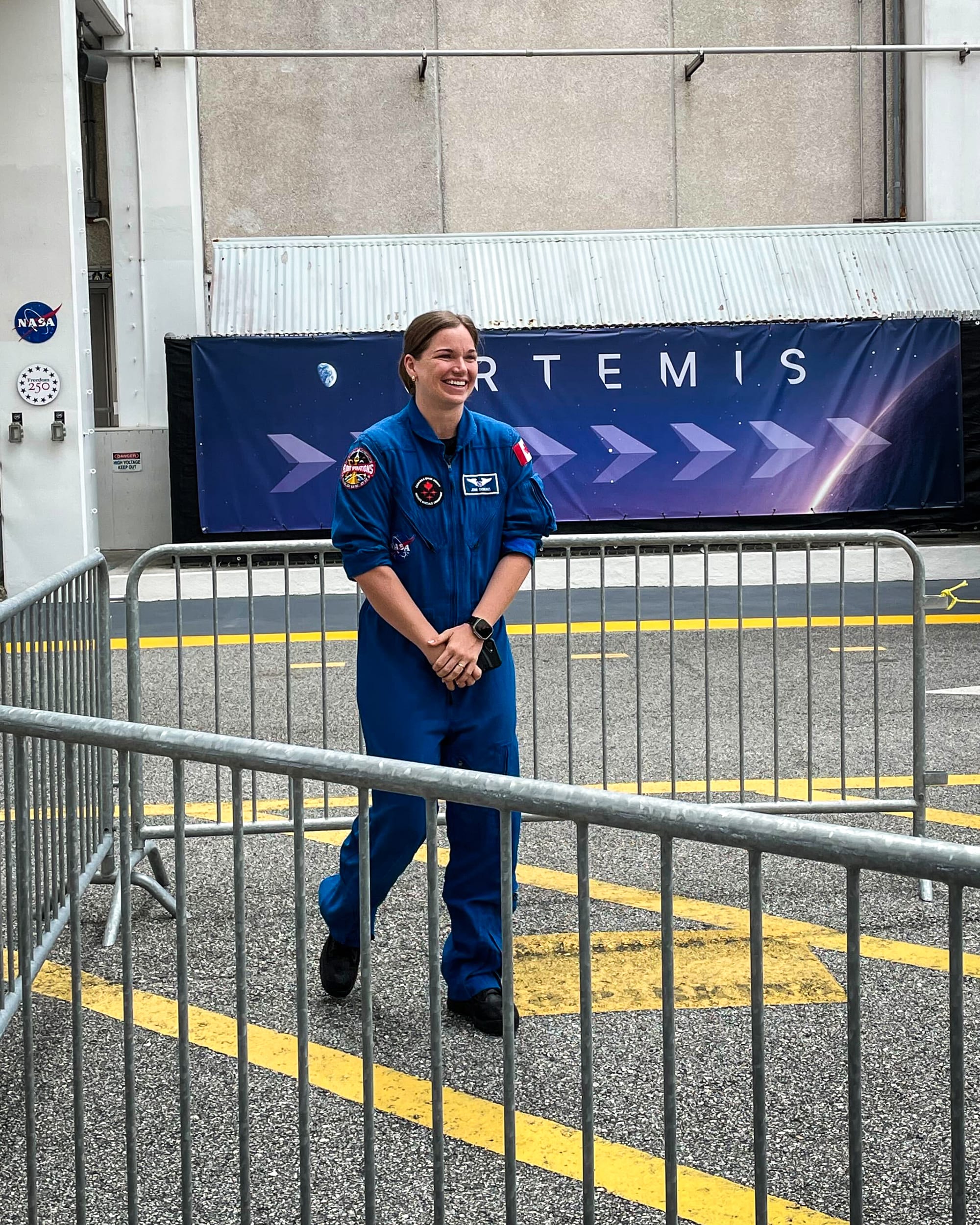 Canadian astronaut Jenni Gibbons has come out of the Neil A. Armstrong Operations and Checkout Building to send off the Artemis II crew. Gibbons is Jeremy Hansen’s backup.