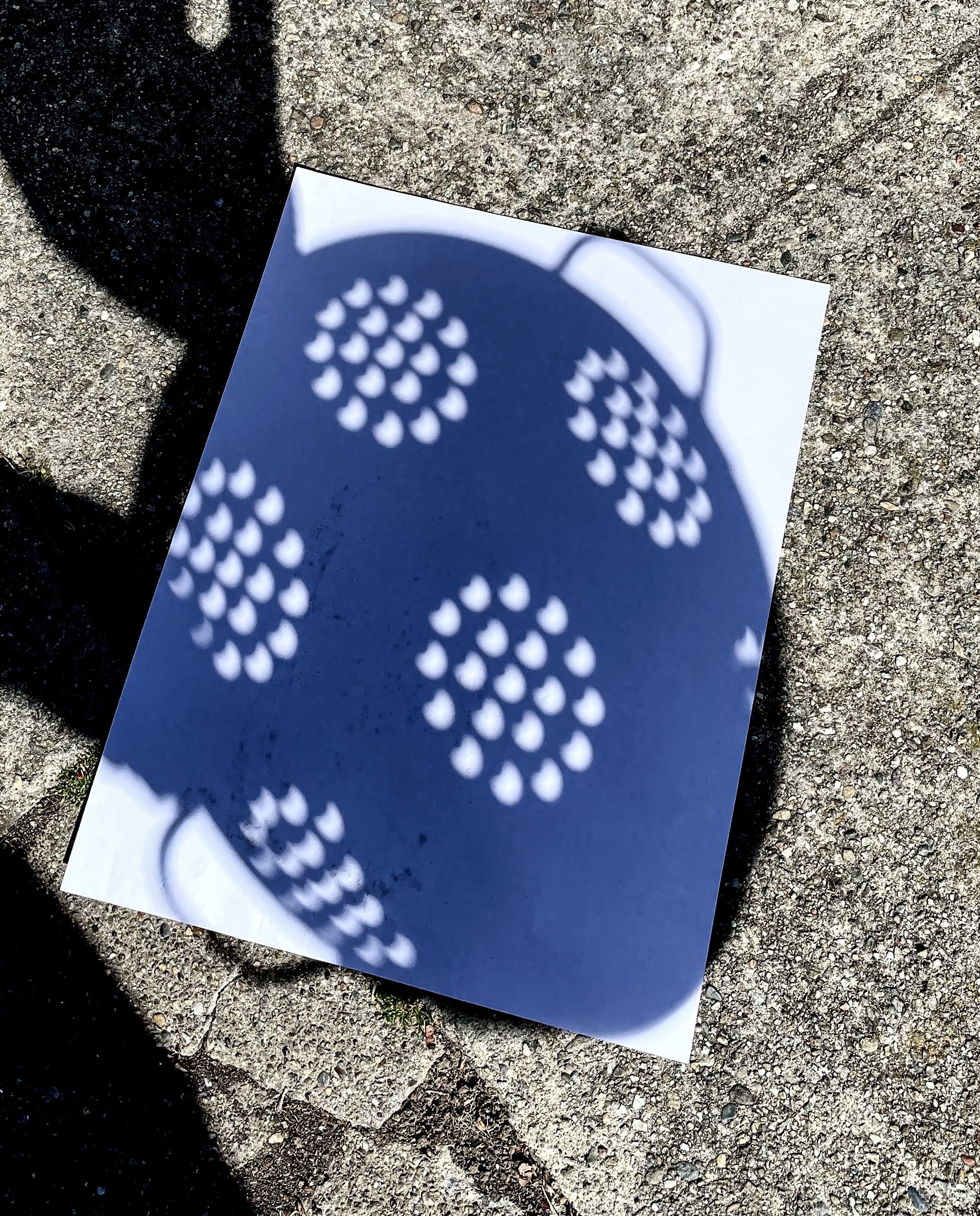 I took the colander from my kitchen out to the sidewalk to enjoy the strangely shaped shadows as the moon appeared to take a bite out of the circles of sunlight I'd normally expect to see through the holes.