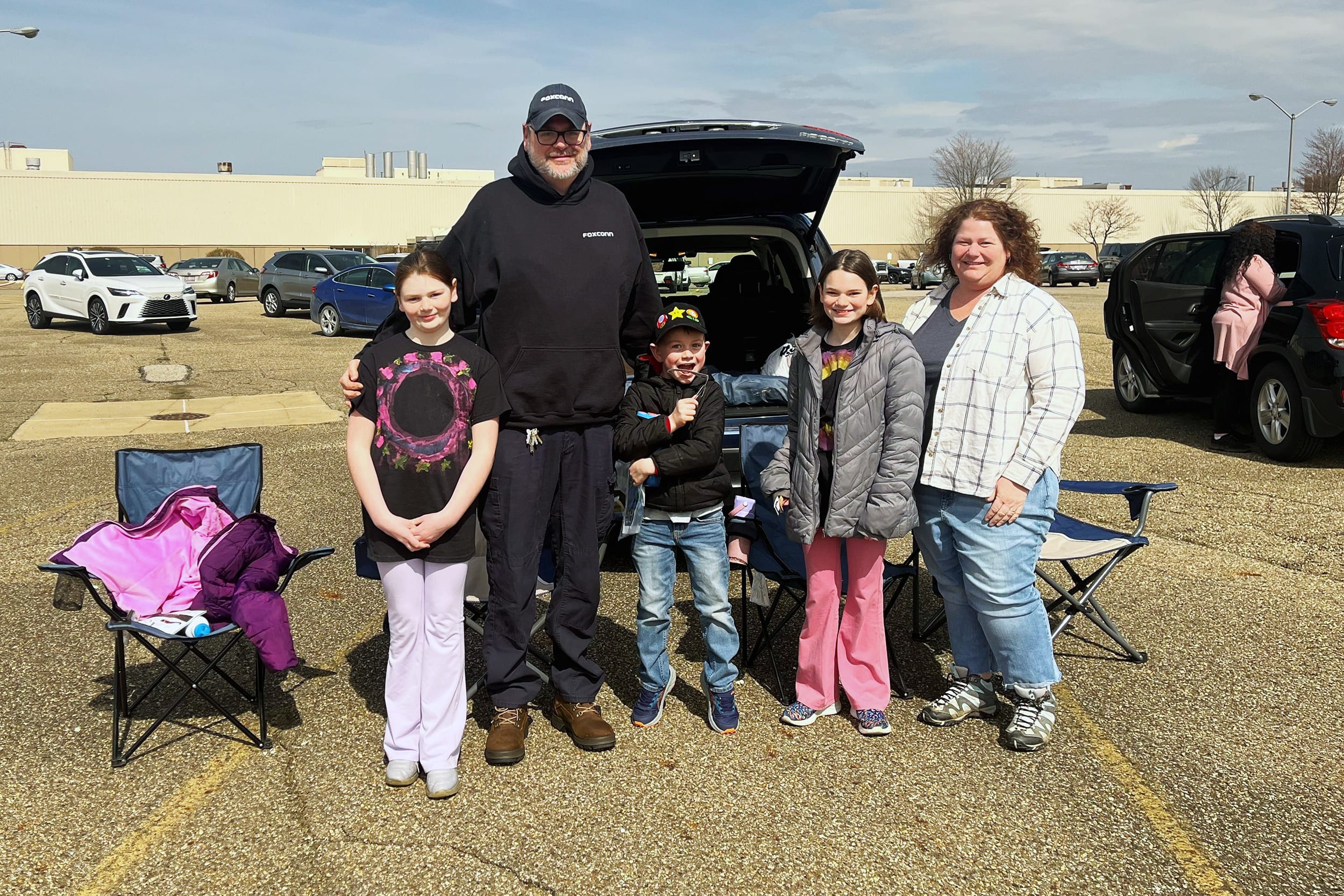 Dan Mincks works at the plant, where his employer opened the parking lot up to the public. He was joined by his wife, Julie, and their three kids.