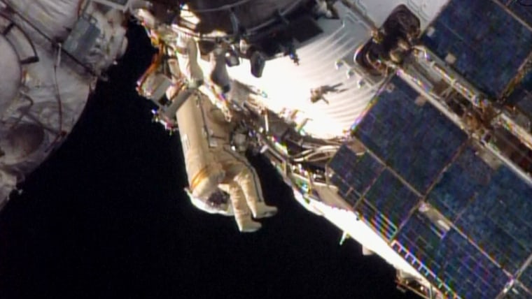 CAPE CANAVERAL, Fla. — A pair of spacewalking astronauts managed to install a new antenna and complete other work Thursday outside the International Space Station, despite stubborn equipment. Russians Alexander Skvortsov and Oleg Artemiev spent more than seven hours outside, longer than expected, and put in an order for hot tea as the tiring work wrapped up. The two struggled with balky clamps and latches on the antenna, but finally secured the equipment with a wire tie. The first-time spacewalkers also replaced an old frame that held experiments with a brand-new boom. Skvortsov and Artemiev had to hustle back inside after wrapping up their work. "I'm hungry and thirsty," one of them radioed. They also said their hands were tired. A plastic handle got away from them right before they closed the hatch.