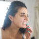 Woman applying peppermint oil on the inside of her wrists using a roll-on applicator