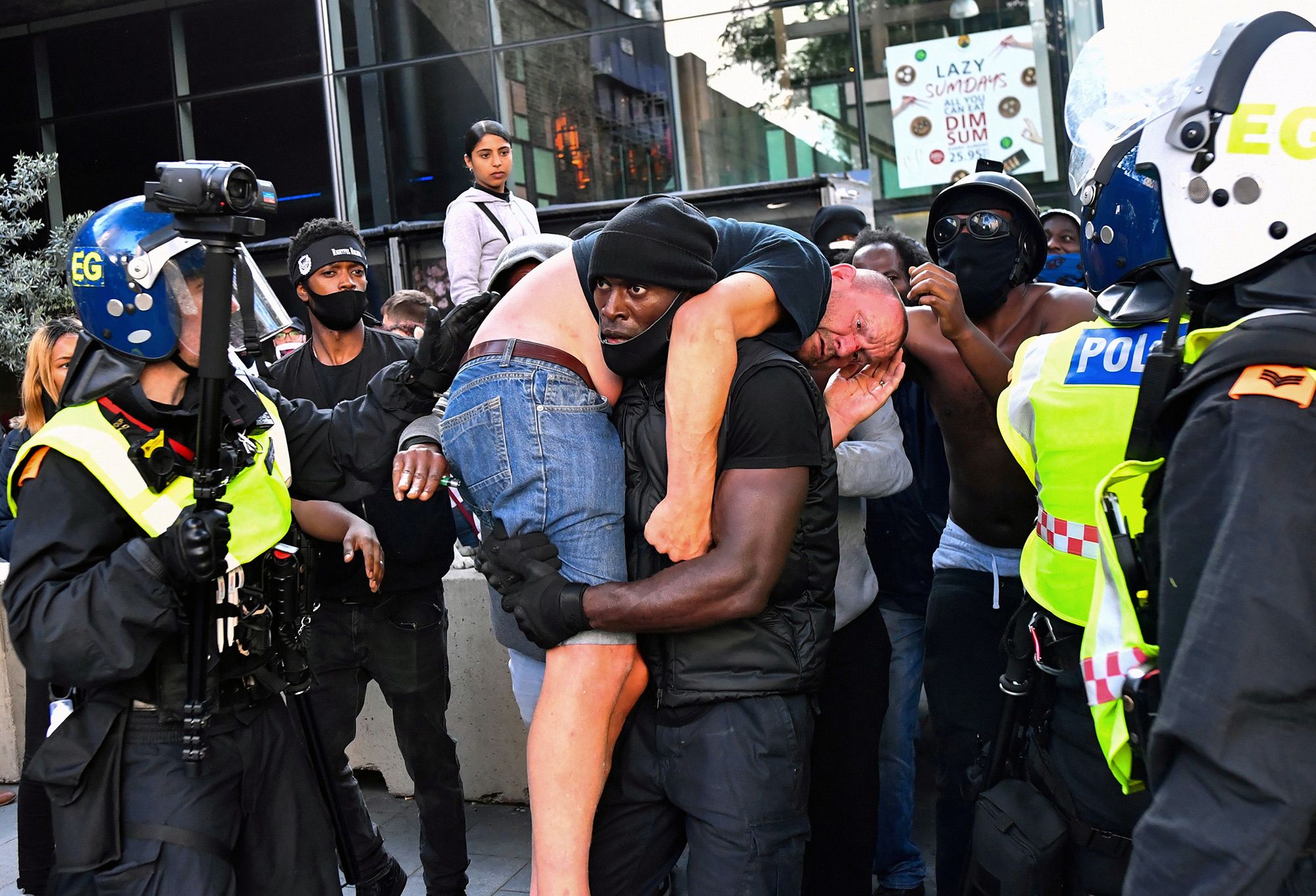 Protester Patrick Hutchinson carries an injured counterprotester to safety near Waterloo station during a Black Lives Matter protest in London on June 13. (Dylan Martinez / Reuters)
