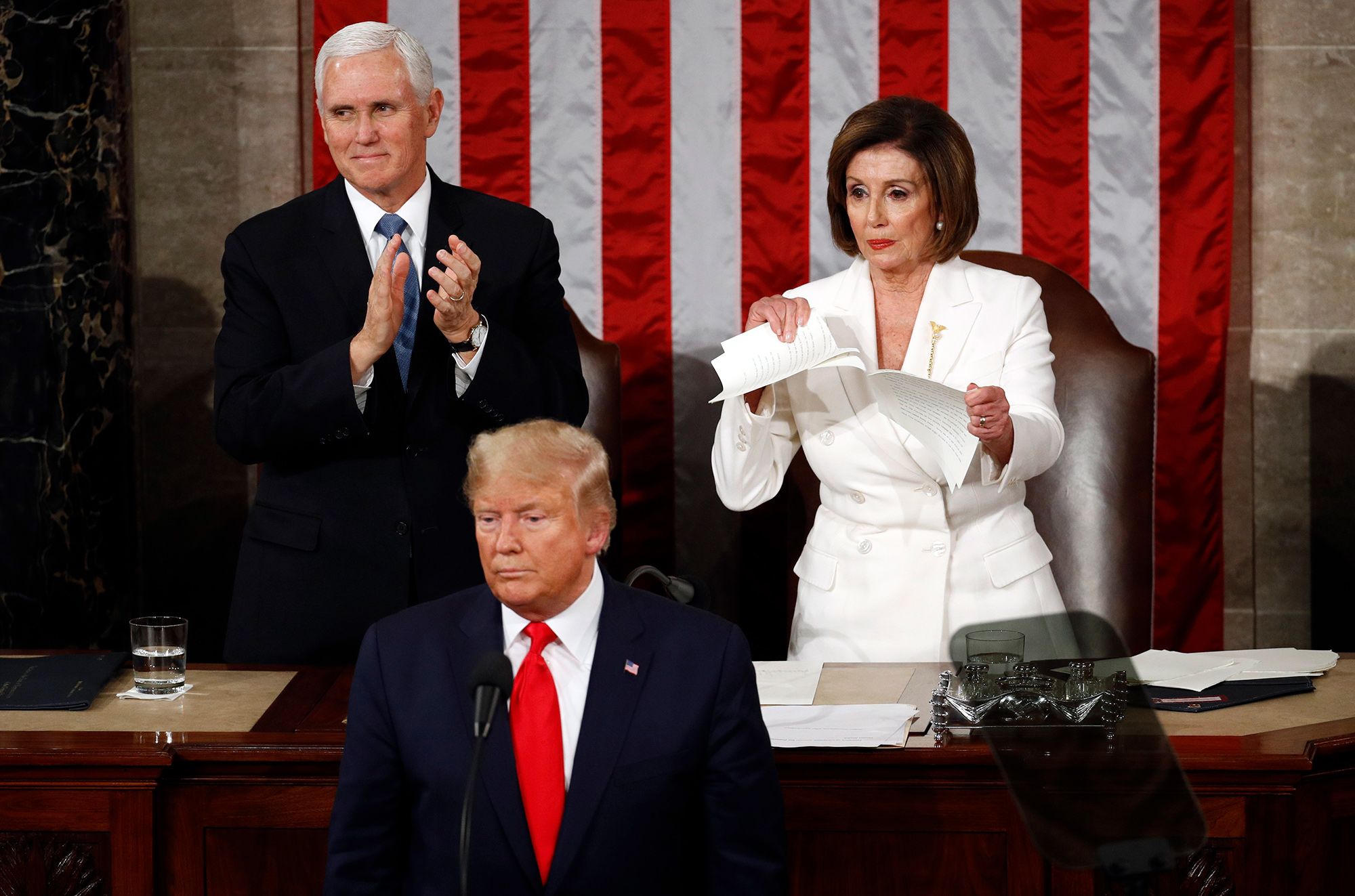 House Speaker Nancy Pelosi tears her copy of President Donald Trump's State of the Union address after he delivered it to a joint session of Congress on Feb. 4. (Patrick Semansky / AP)