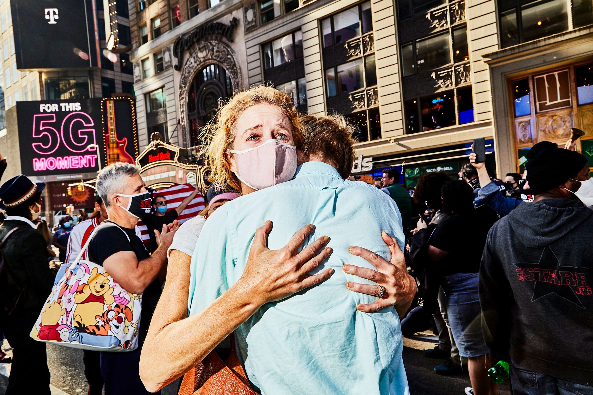 New Yorkers celebrate Joe Biden's election victory in Times Square on Nov. 7. (Amy Lombard / for NBC News)