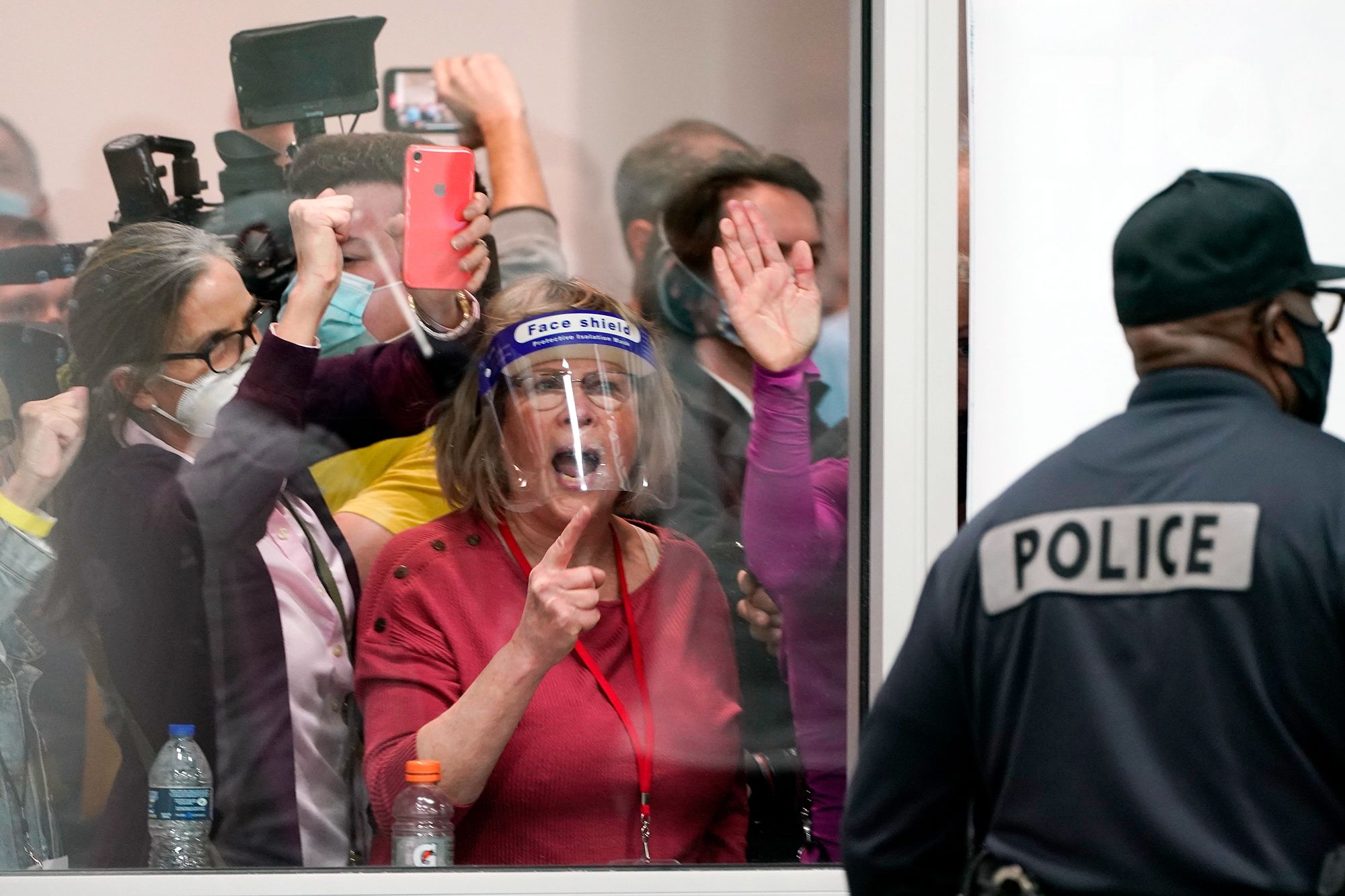 Election challengers look through the windows of the central counting board in Detroit as police keep additional challengers from entering due to overcrowding on Nov. 4. (Carlos Osorio / AP)